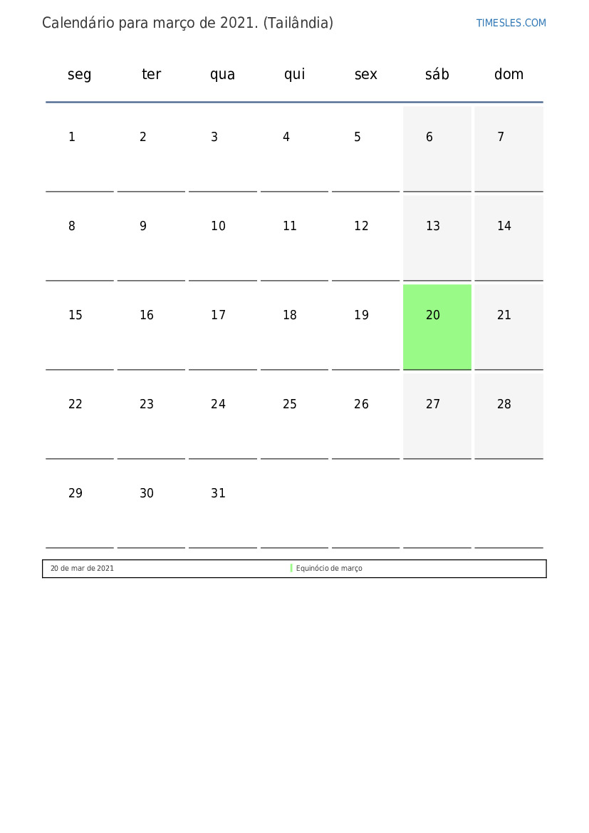 O mês de março contém 31 dias. Este é 3 mês de 2021. Estação do ano: primavera. O mês de março começa na segunda-feira e termina na quarta-feira. No mês de março de 2021, há 1 feriado e dia de folga Na Tailândia.