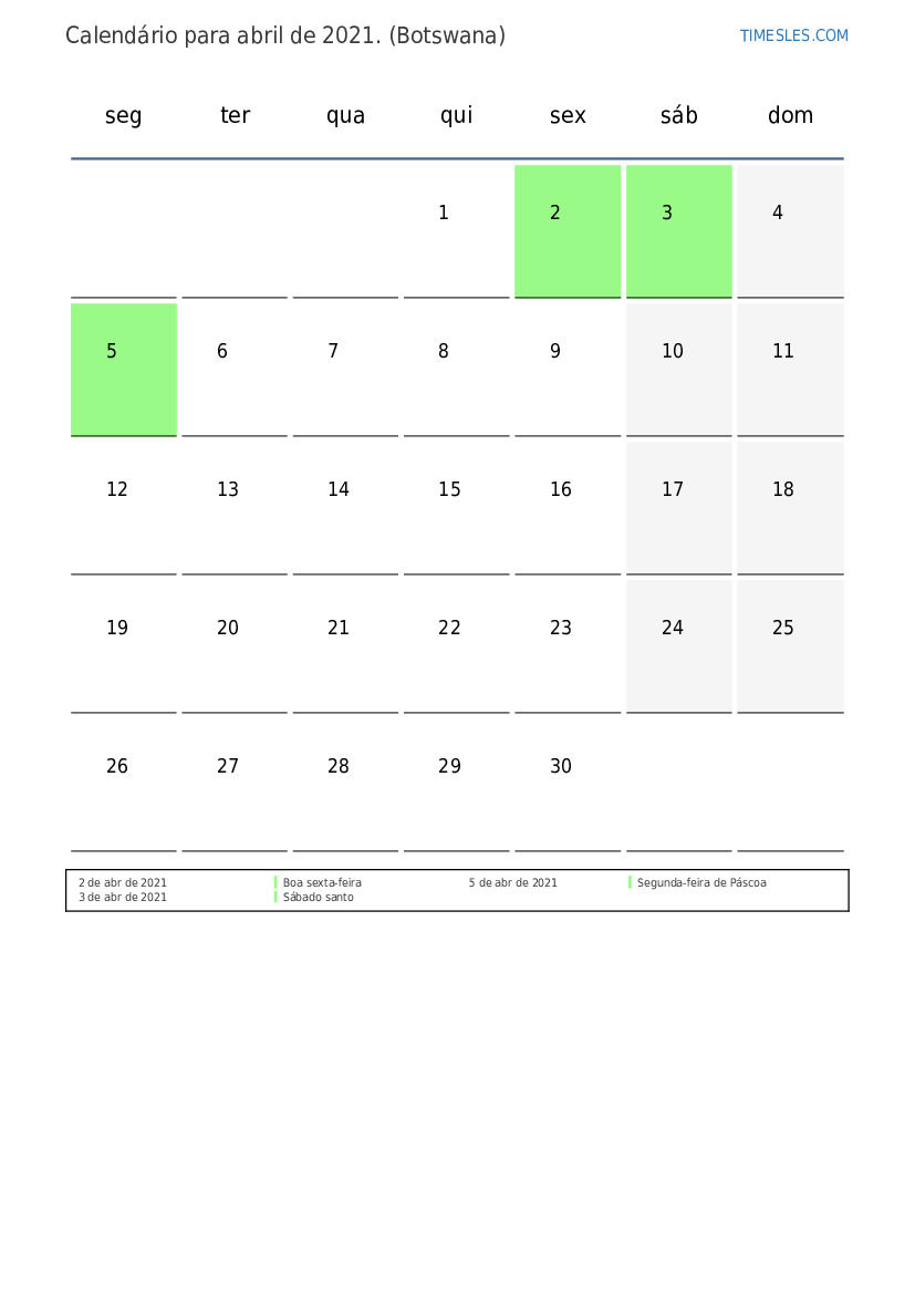 O mês de abril contém 30 dias. Este é 4 mês de 2021. Estação do ano: primavera. O mês de abril começa na quinta feira e termina na sexta. No mês de abril de 2021, há 3 feriados e dias de folga em Botswana.