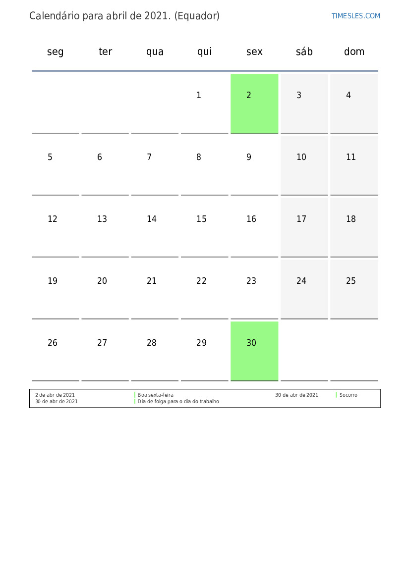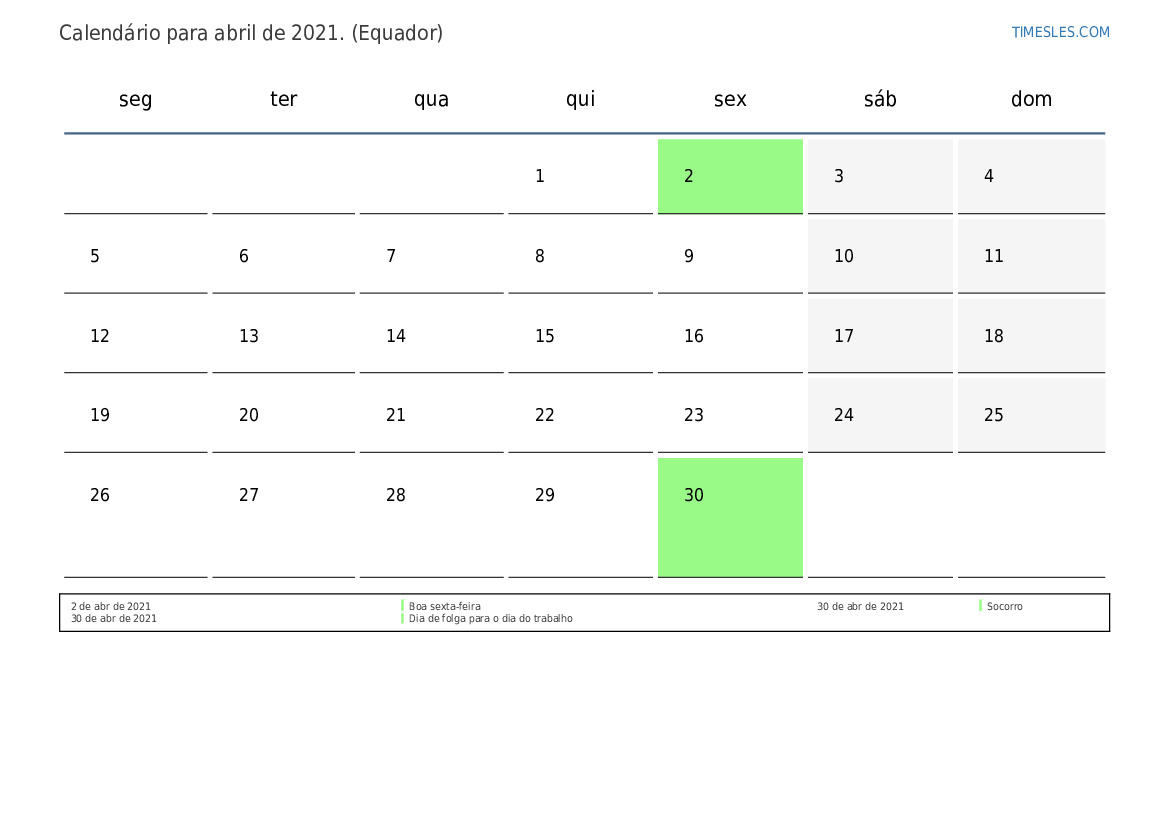 Calendário de feriados e fins de semana para abril de 2021 para o equador