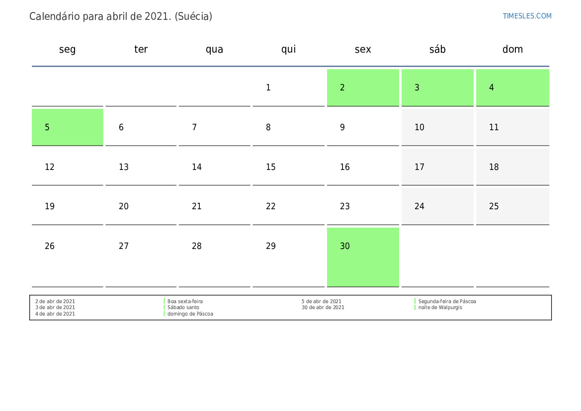 Calendário de feriados e fins de semana para abril de 2021 para a Suécia