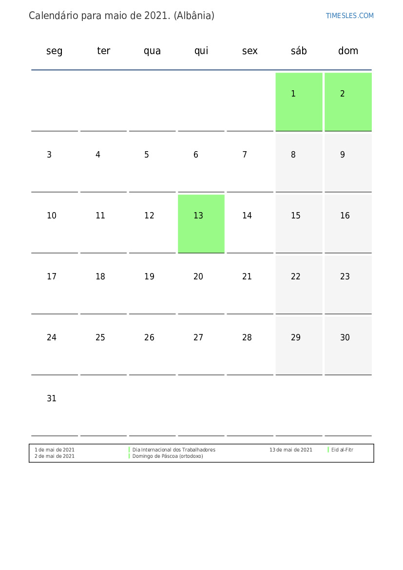 Calendário de feriados e fins de semana para maio de 2021 para a Albânia