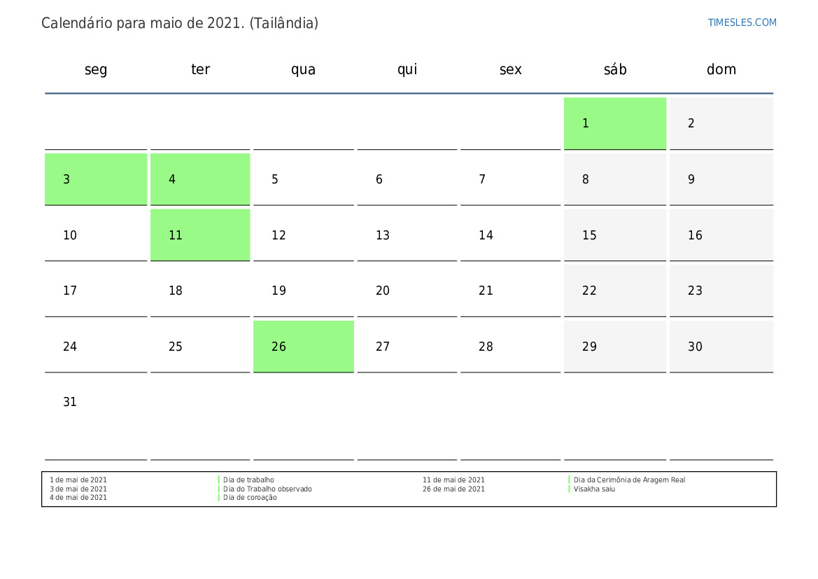 Calendário de feriados e fins de semana para maio de 2021 para a Tailândia