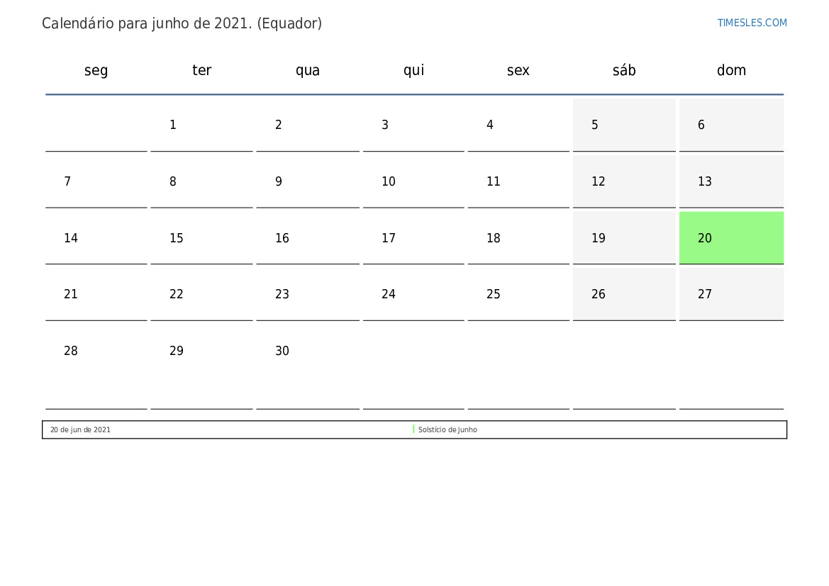 Calendário de junho de 2021 para o equador