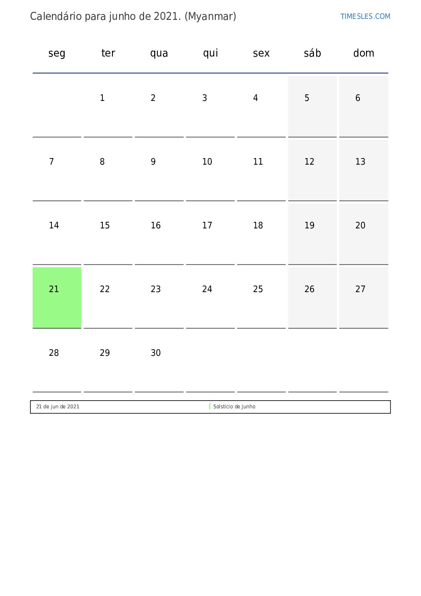 O mês de junho contém 30 dias. Este é 6 mês de 2021. Estação do ano: verão. O mês de junho começa na terça-feira e termina na quarta-feira. No mês de junho de 2021, há 1 feriado e dia de folga em Mianmar.