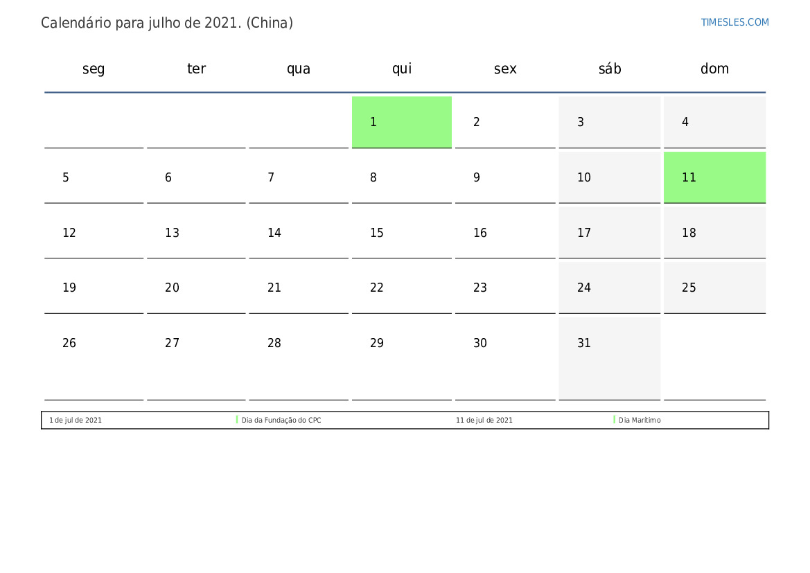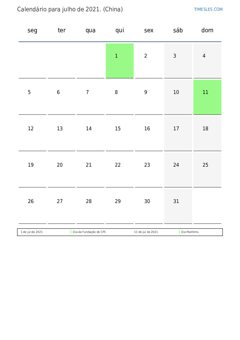 Calendário de feriados e fins de semana para julho de 2021 para a china