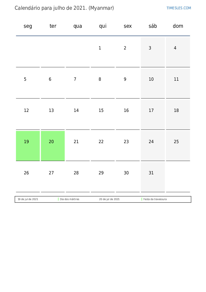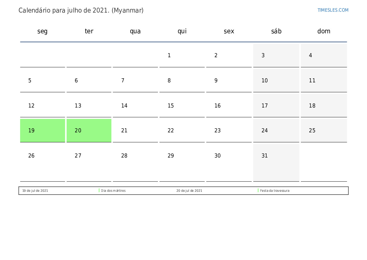Calendário de feriados e fins de semana para julho de 2021 para Mianmar