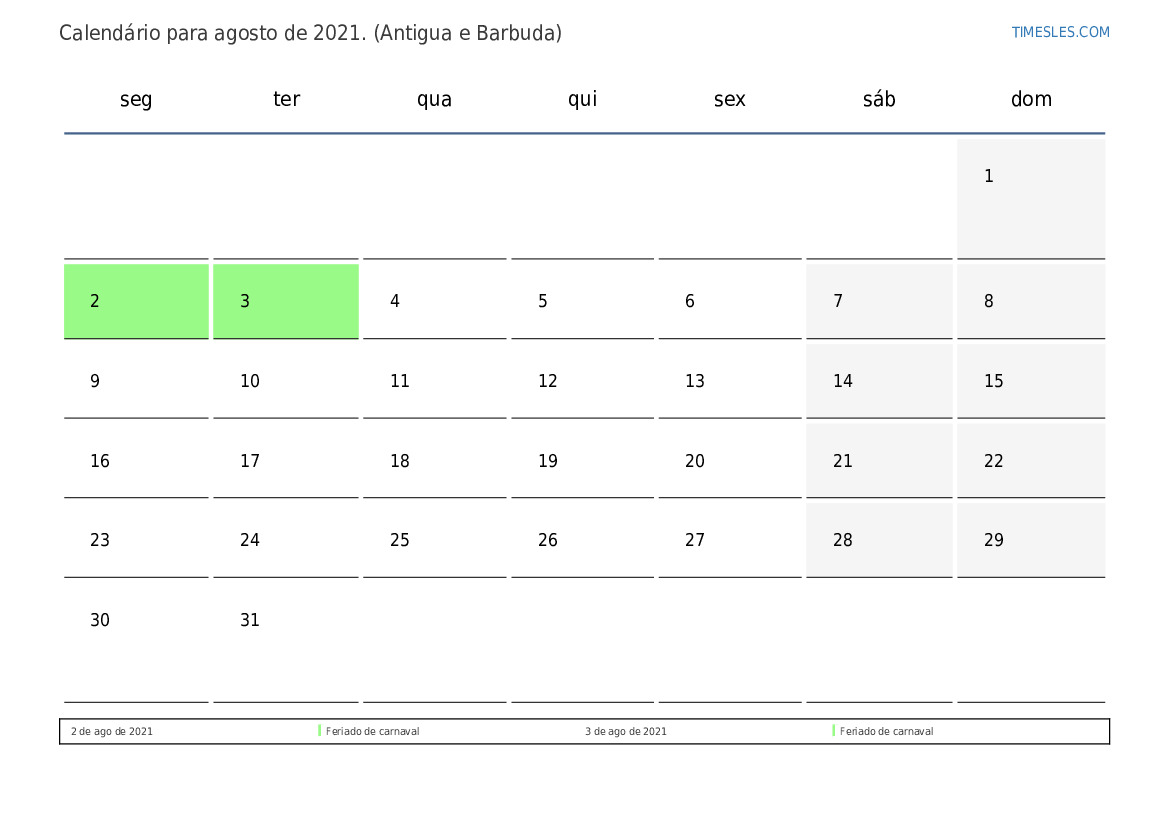 Calendário de agosto de 2021 para Antigua e Barbuda