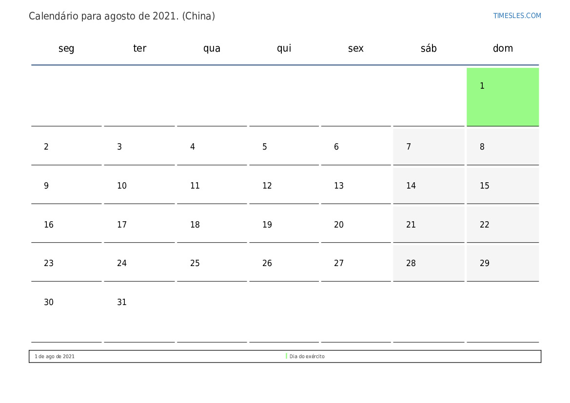 Calendário de feriados e fins de semana para agosto de 2021 para a china