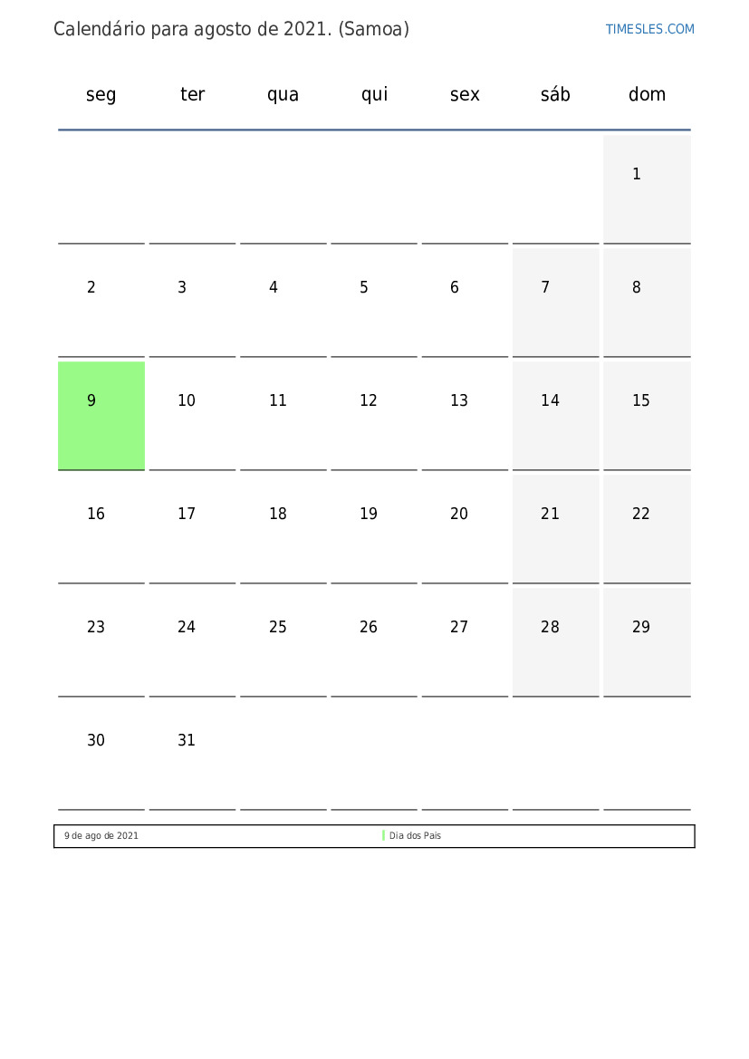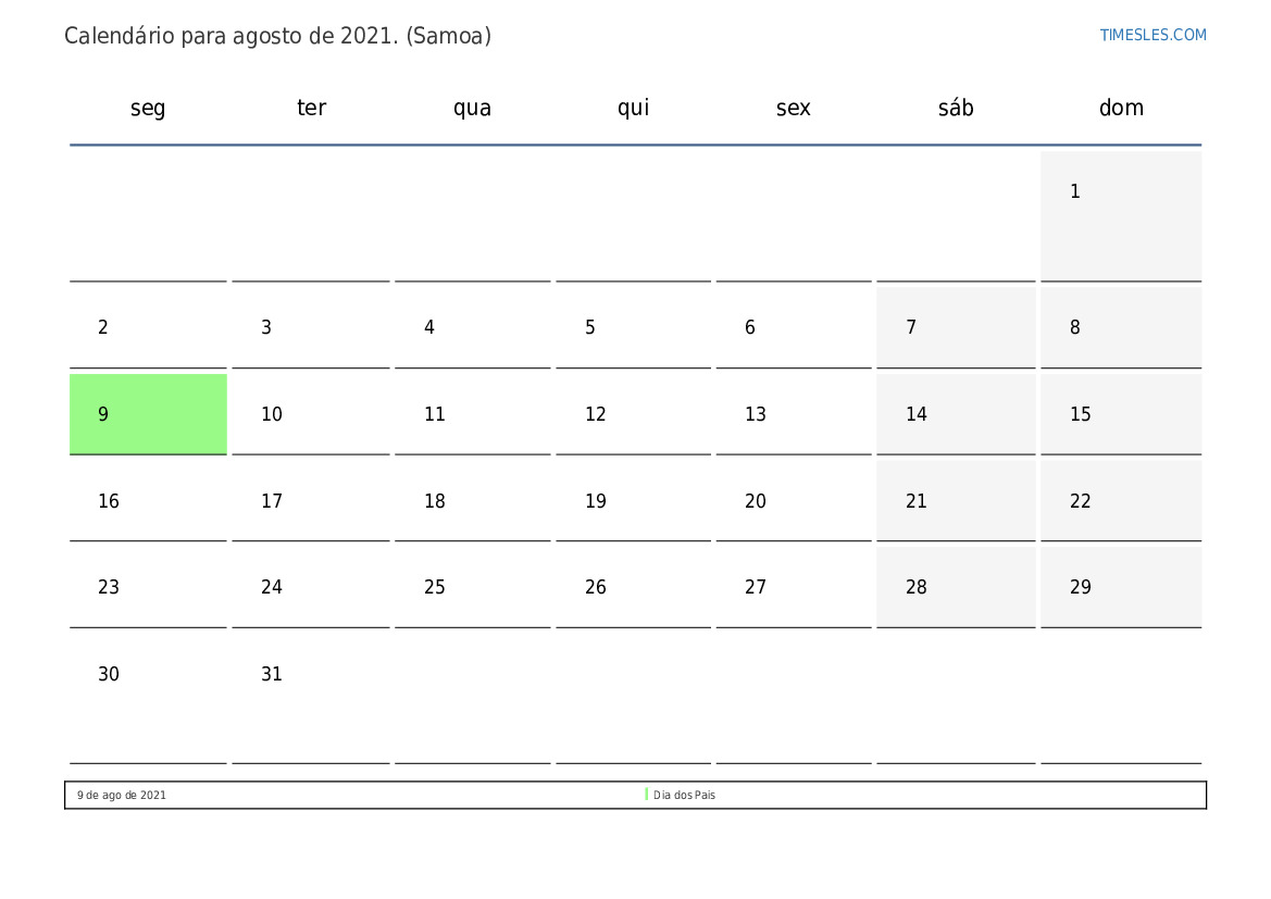 Calendário de feriados e fins de semana para agosto de 2021 para Samoa