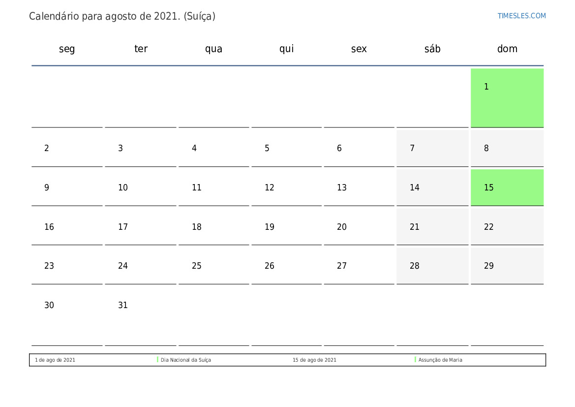 Calendário de feriados e fins de semana para agosto de 2021 para a Suíça