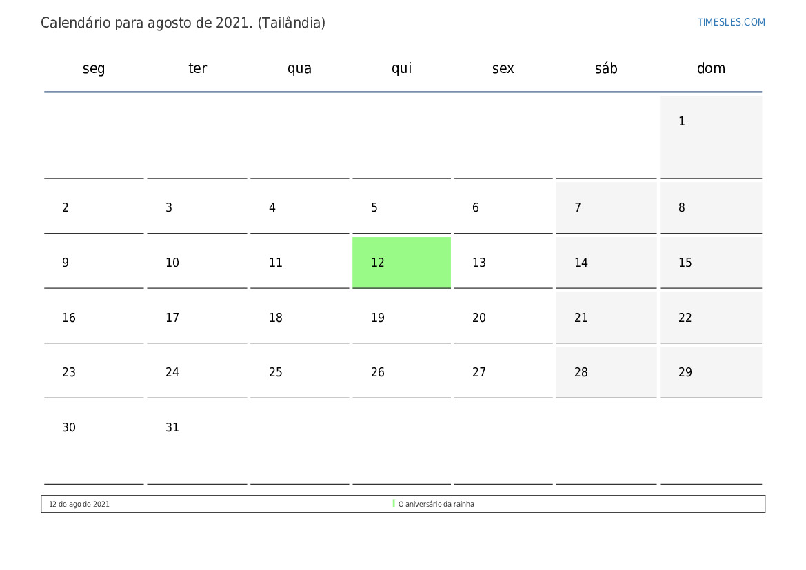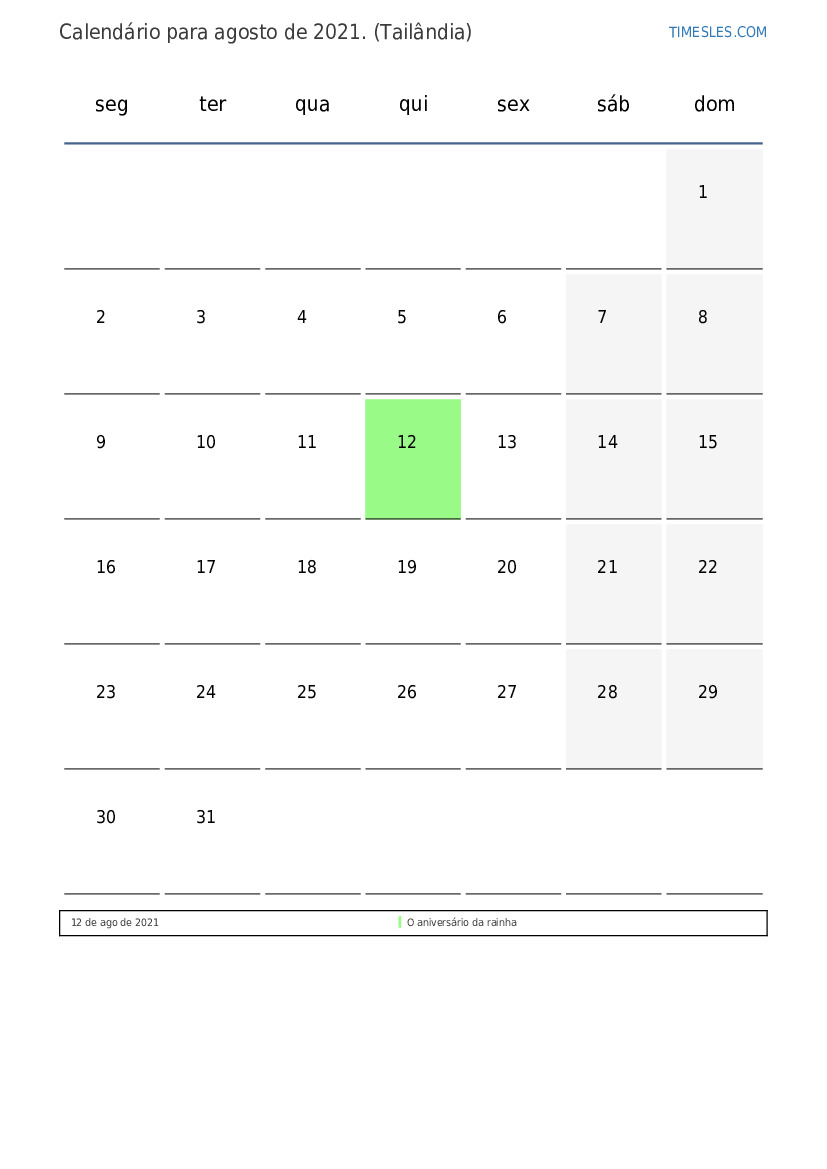 Baixe e imprima calendário em PDF com feriados e fins de semana para agosto de 2021 para a Tailândia