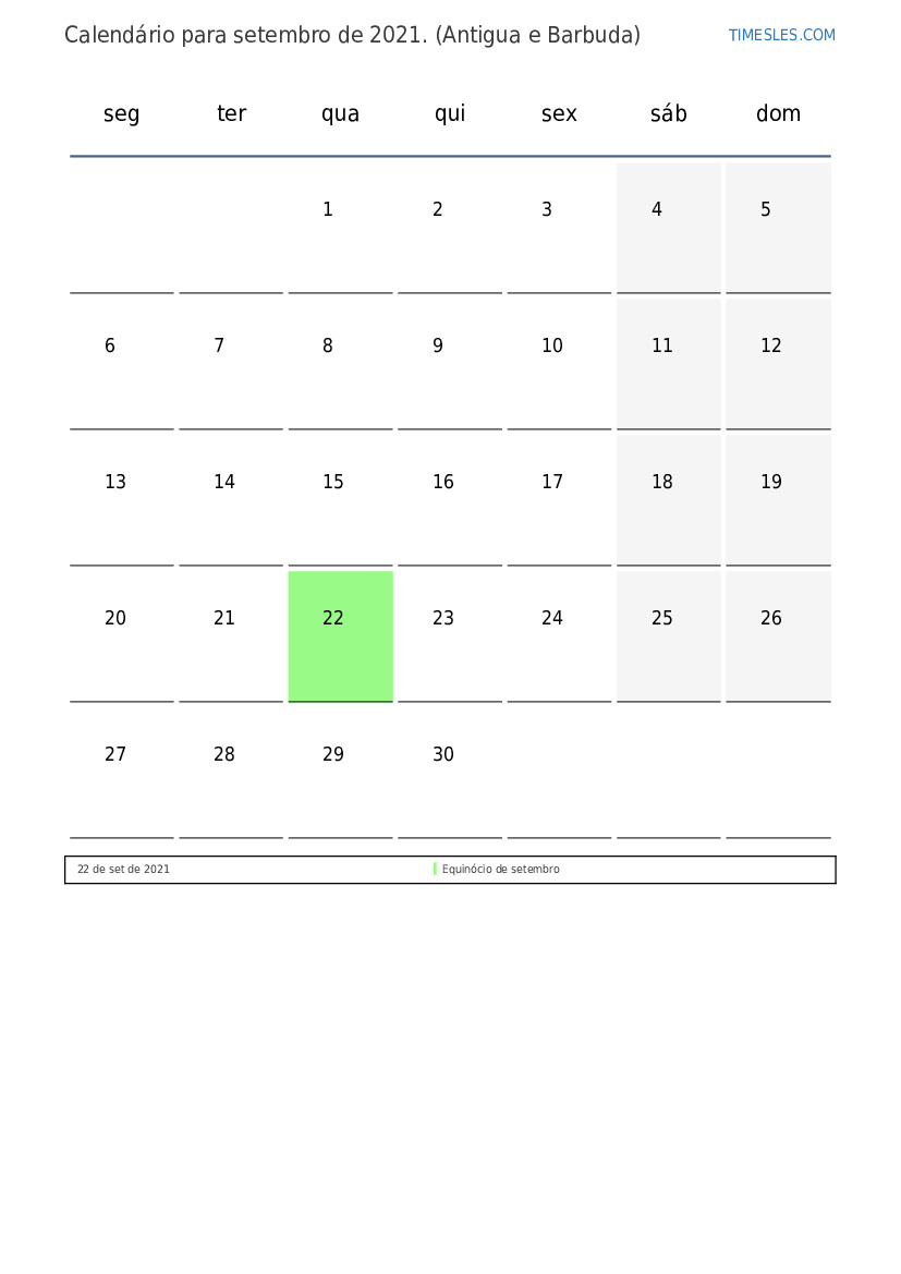 O mês de setembro contém 30 dias. Este é 9 mês de 2021. Estação do ano: outono. O mês de setembro começa na quarta-feira e termina na quinta feira. No mês de setembro de 2021, há 1 feriado e dia de folga em Antigua e Barbuda.