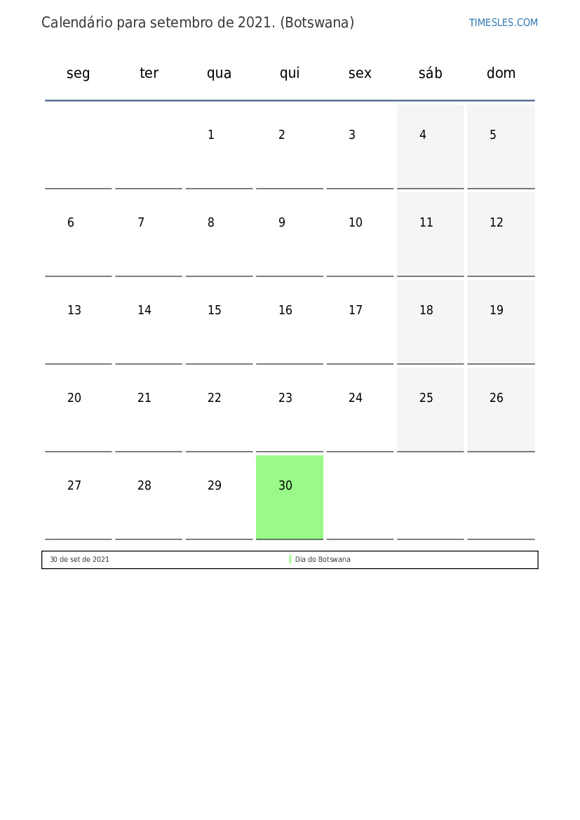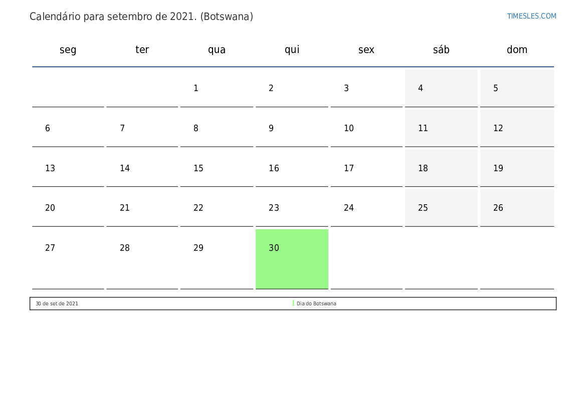 O mês de setembro contém 30 dias. Este é 9 mês de 2021. Estação do ano: outono. O mês de setembro começa na quarta-feira e termina na quinta feira. No mês de setembro de 2021, há 2 feriados e dias de folga em Botswana.