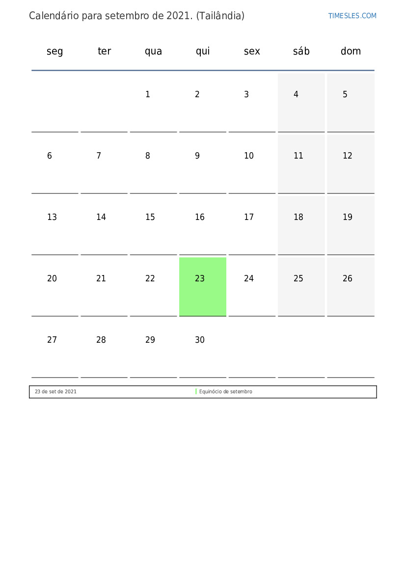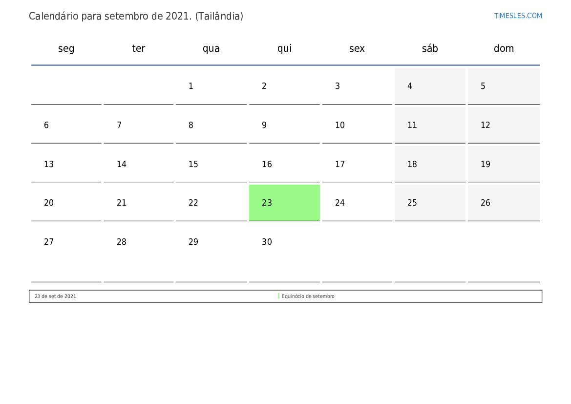 O mês de setembro contém 30 dias. Este é 9 mês de 2021. Estação do ano: outono. O mês de setembro começa na quarta-feira e termina na quinta feira. No mês de setembro de 2021, há 1 feriado e dia de folga Na Tailândia.