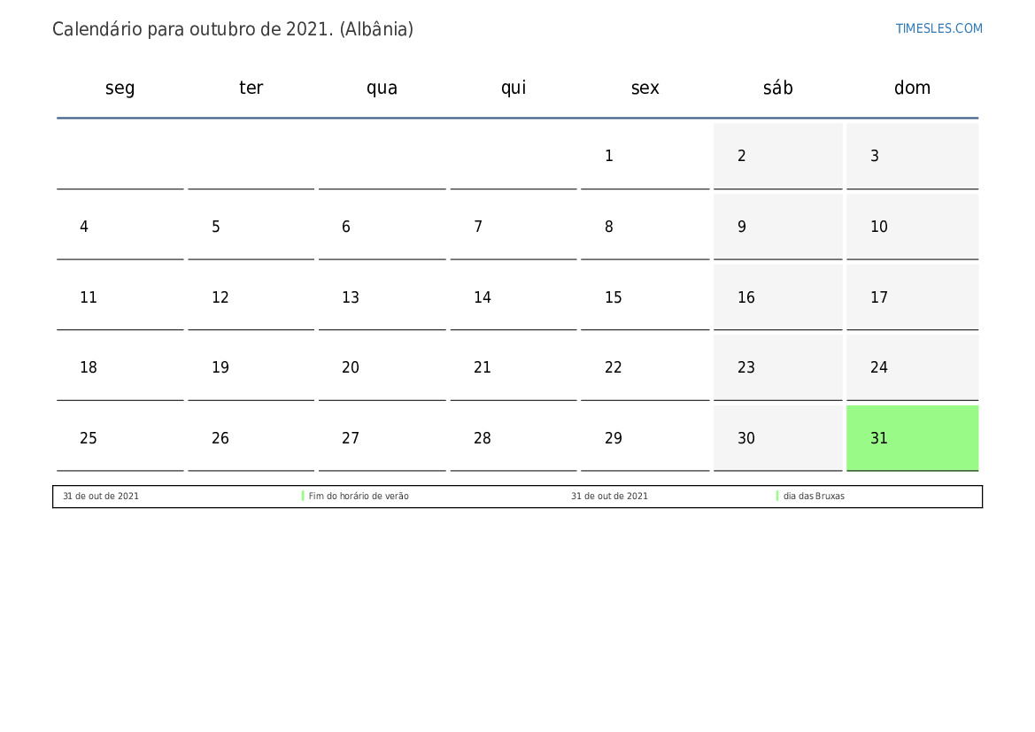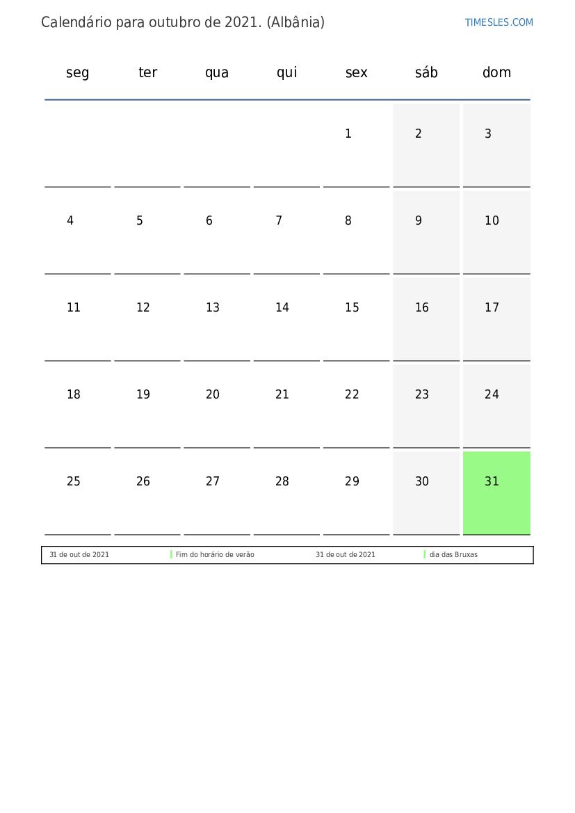 Calendário de feriados e fins de semana para outubro de 2021 para a Albânia