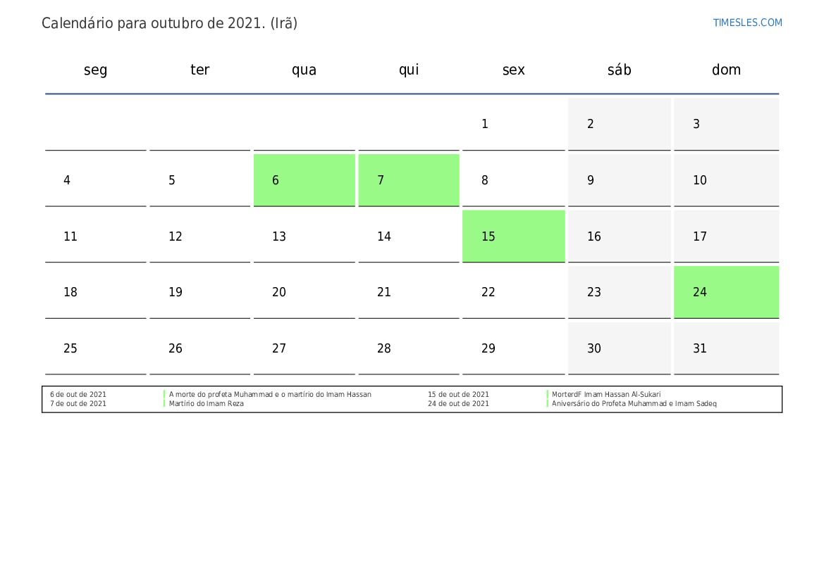Calendário de feriados e fins de semana para outubro de 2021 para o irã