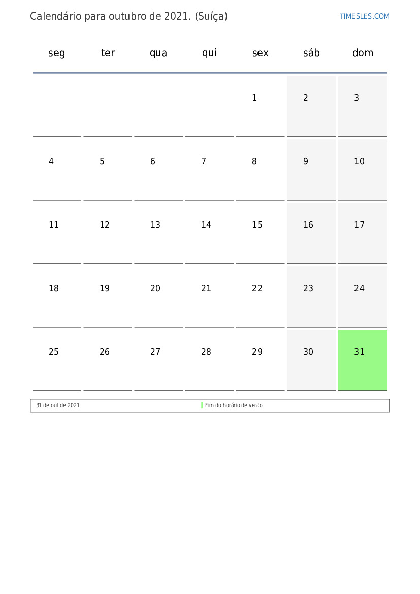 Calendário de feriados e fins de semana para outubro de 2021 para a Suíça