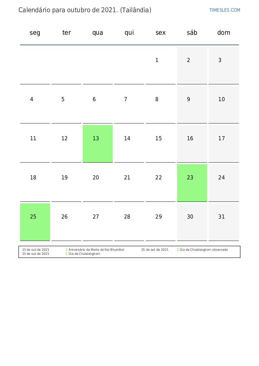 Calendário de outubro de 2021 para a Tailândia