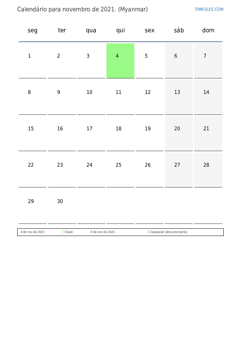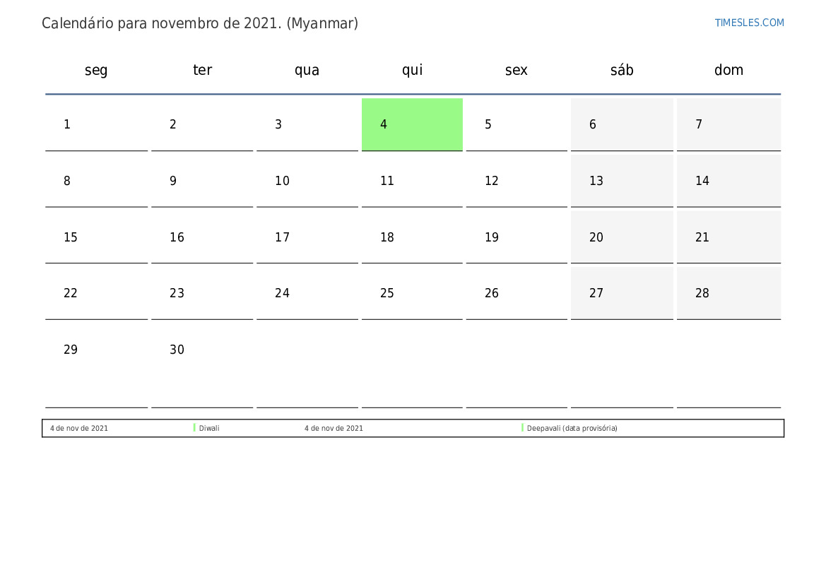 O mês de novembro contém 30 dias. Este é 11 mês de 2021. Estação do ano: outono. O mês de novembro começa na segunda-feira e termina na terça-feira. No mês de novembro de 2021, há 2 feriados e dias de folga em Mianmar.