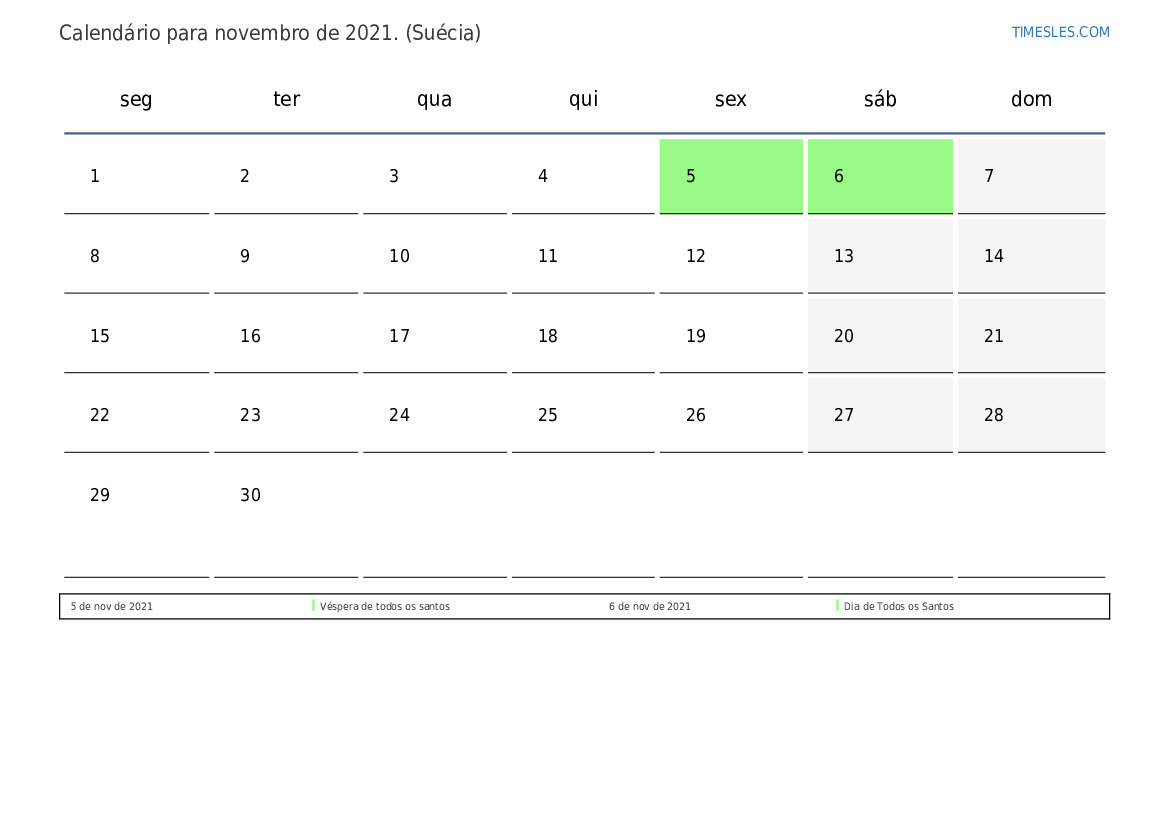 Calendário de feriados e fins de semana para novembro de 2021 para a Suécia