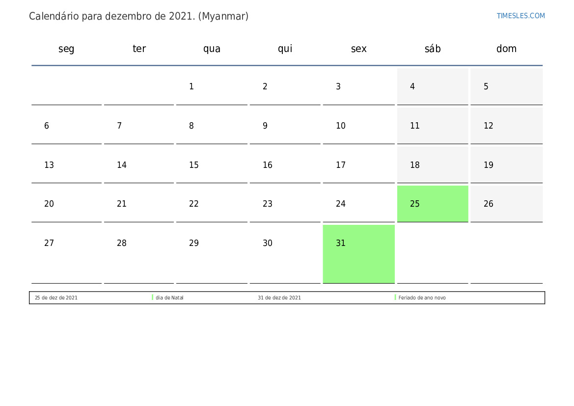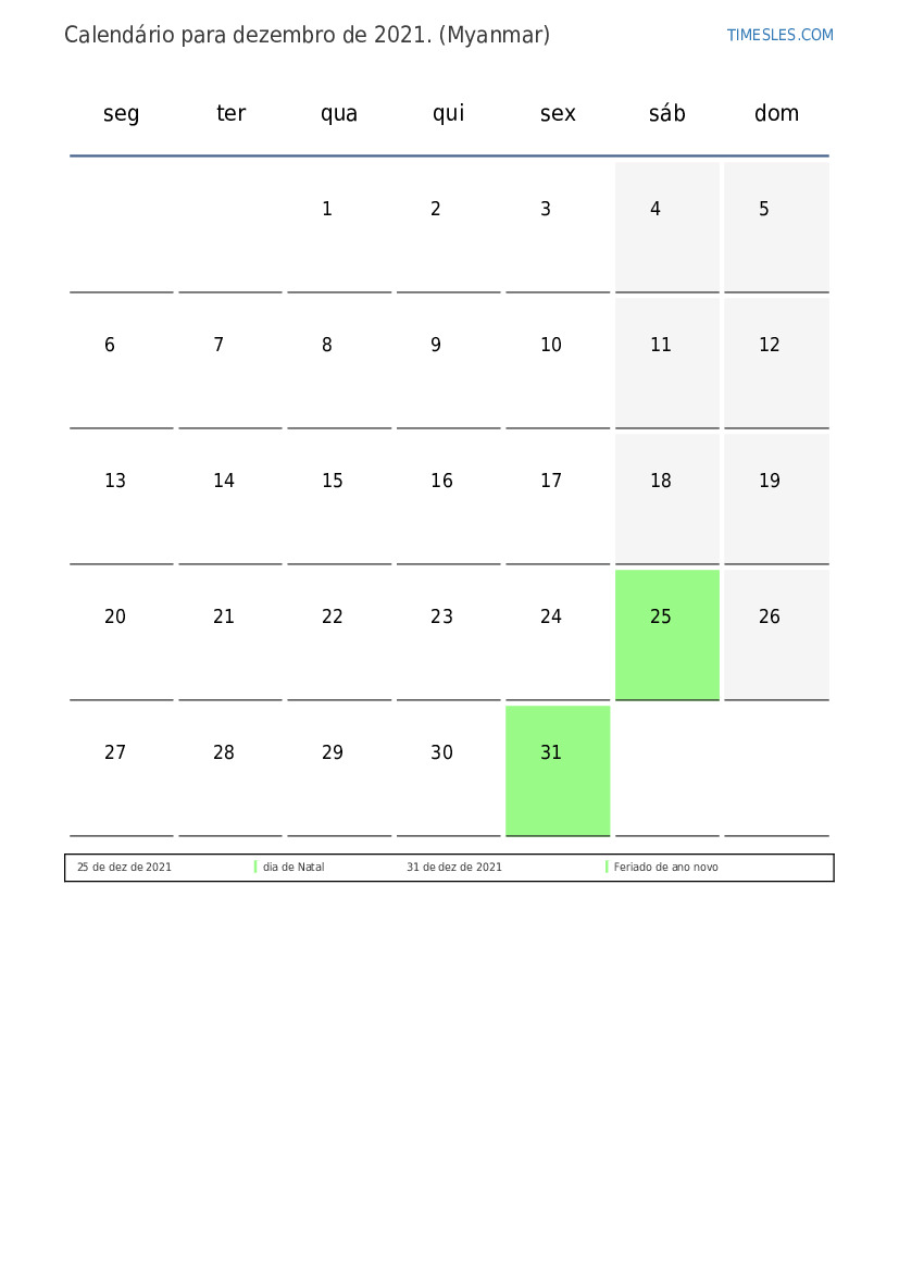 Baixe e imprima calendário em PDF com feriados e fins de semana para dezembro de 2021 para Mianmar