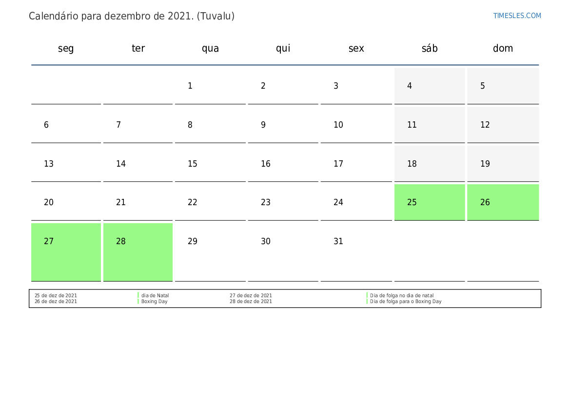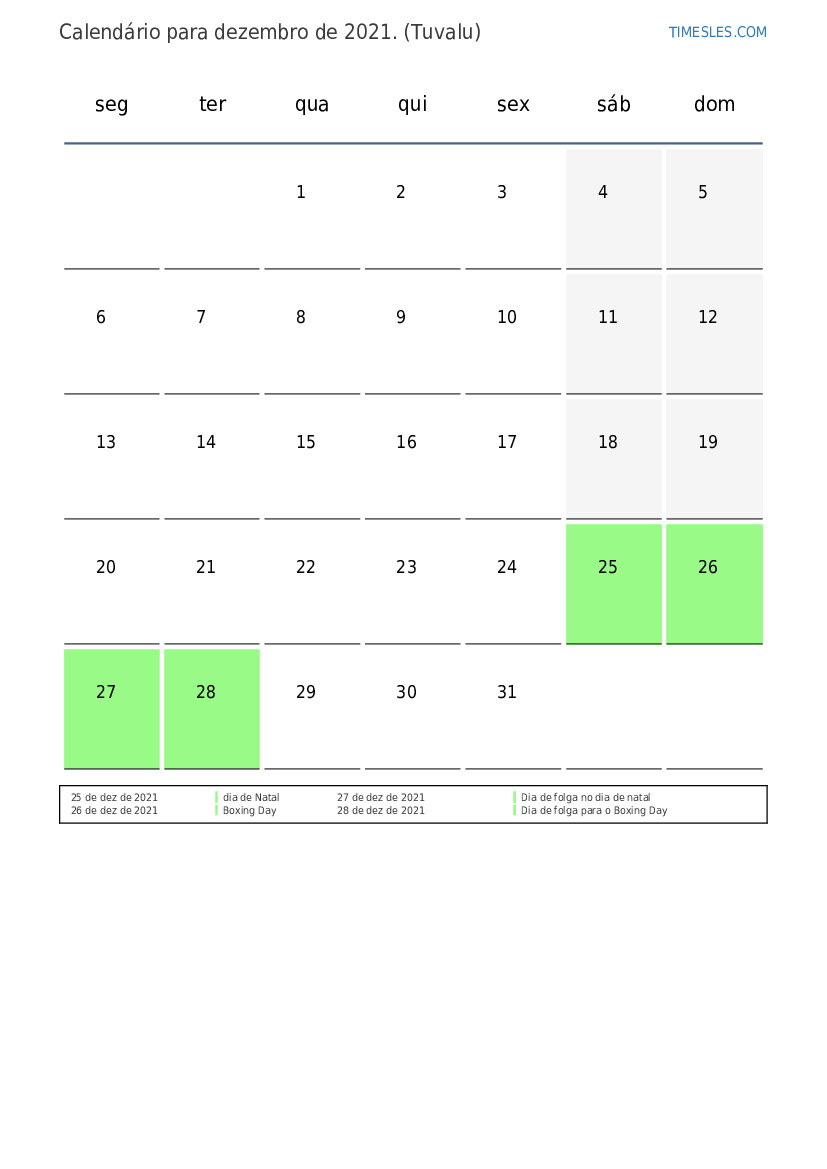Calendário de feriados e fins de semana para dezembro de 2021 para Tuvalu
