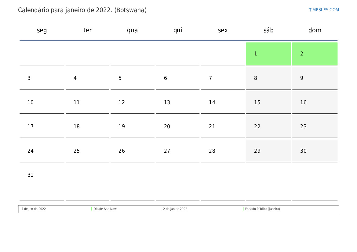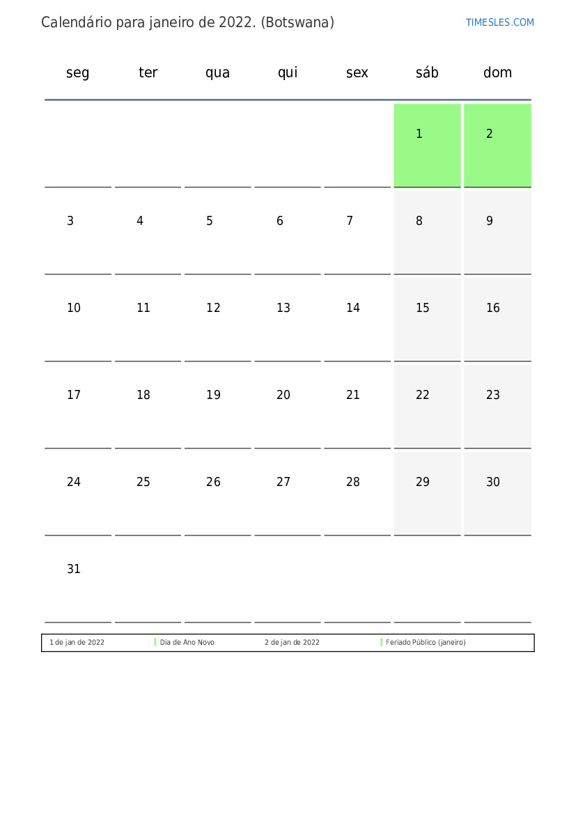 Calendário de feriados e fins de semana para janeiro de 2022 para o Botswana