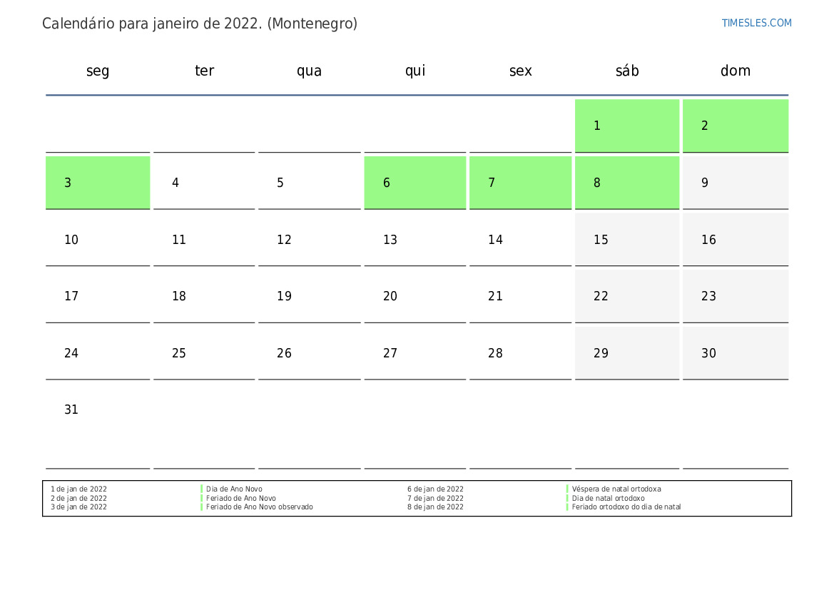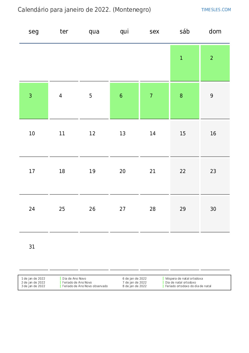 O mês de janeiro contém 31 dias. Este é 1 mês de 2022. Estação do ano: inverno. O mês de janeiro começa no sábado e termina na segunda-feira. No mês de janeiro de 2022, há 6 feriados e dias de folga em Montenegro.