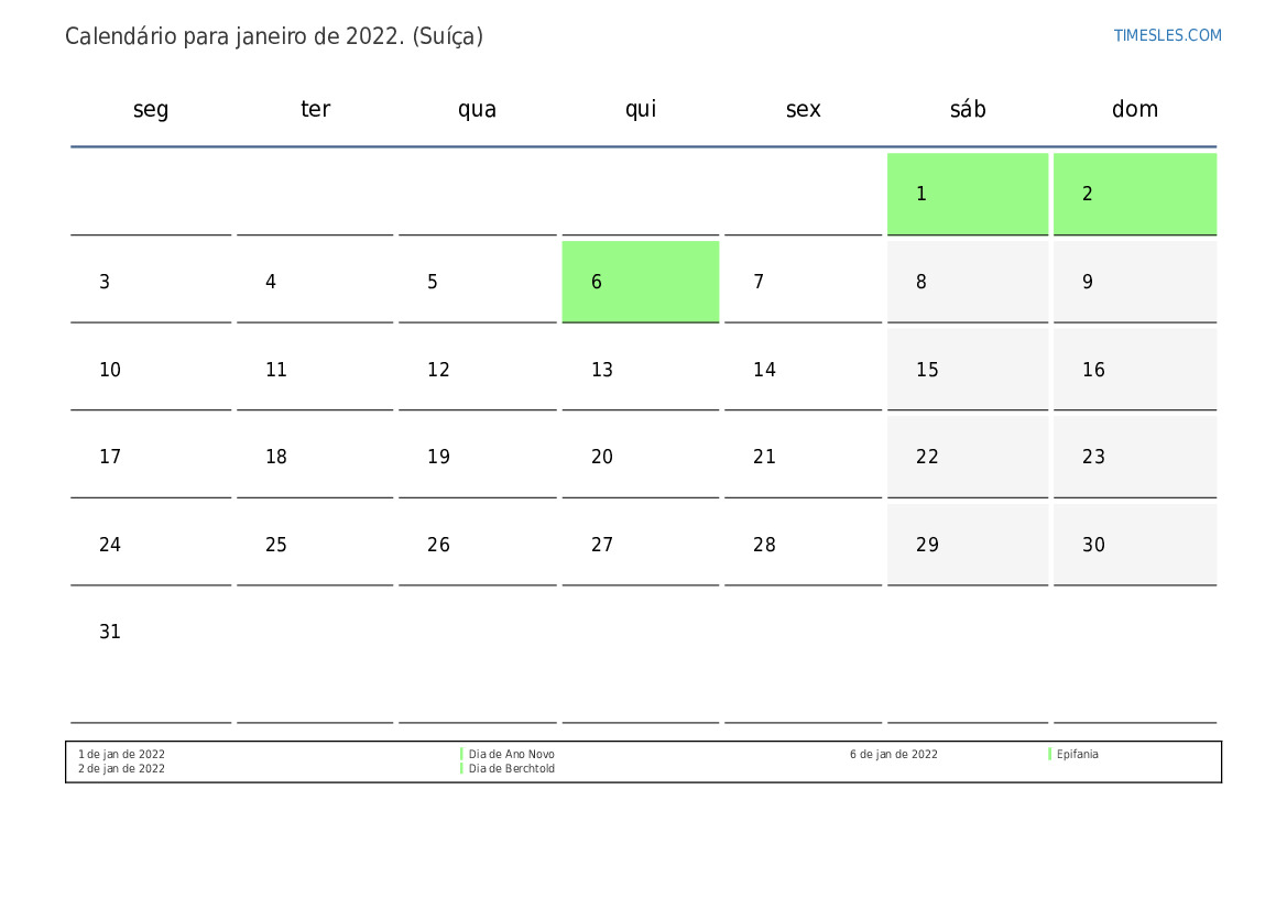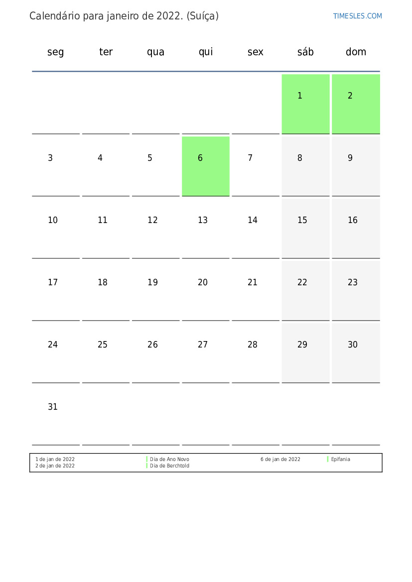 Calendário de feriados e fins de semana para janeiro de 2022 para a Suíça