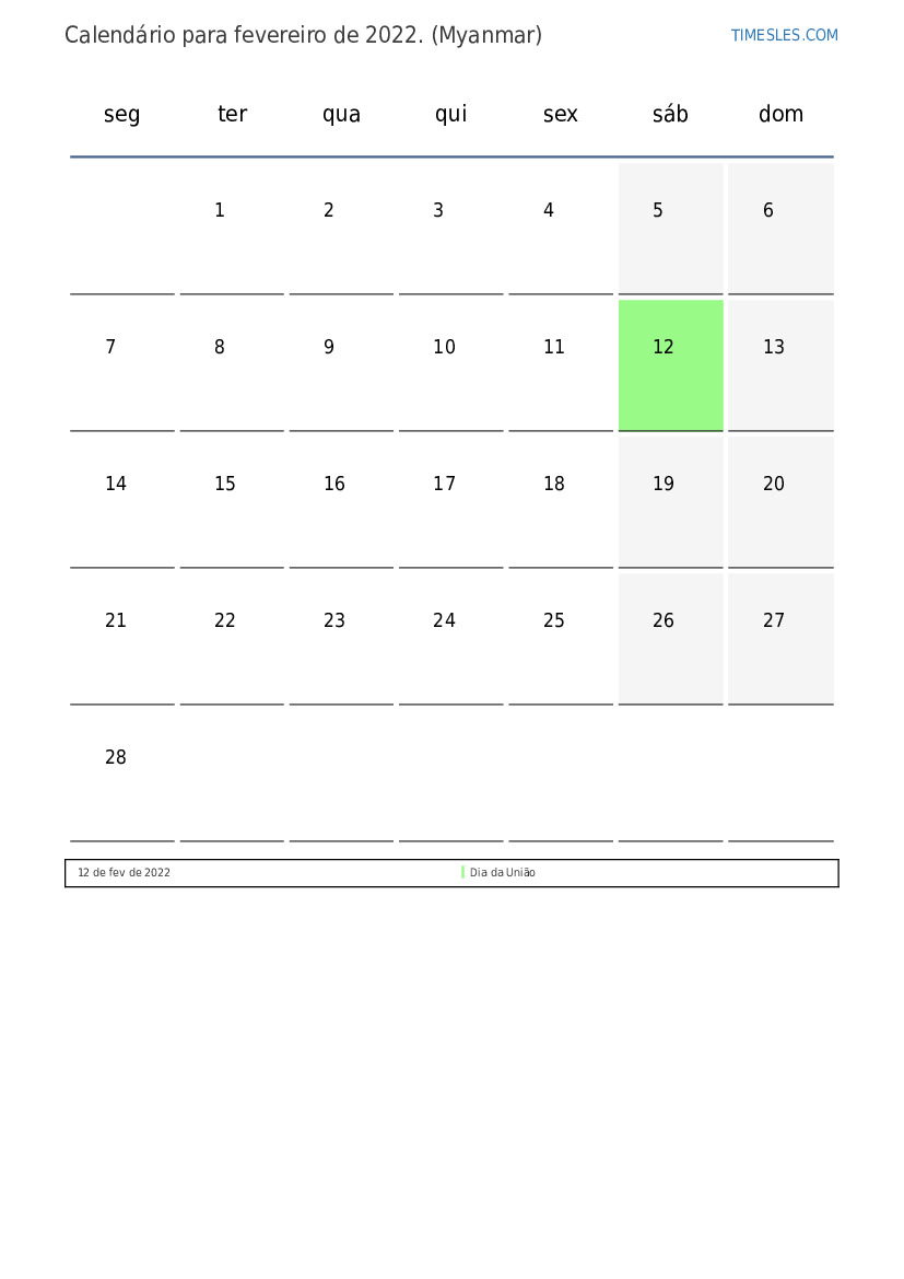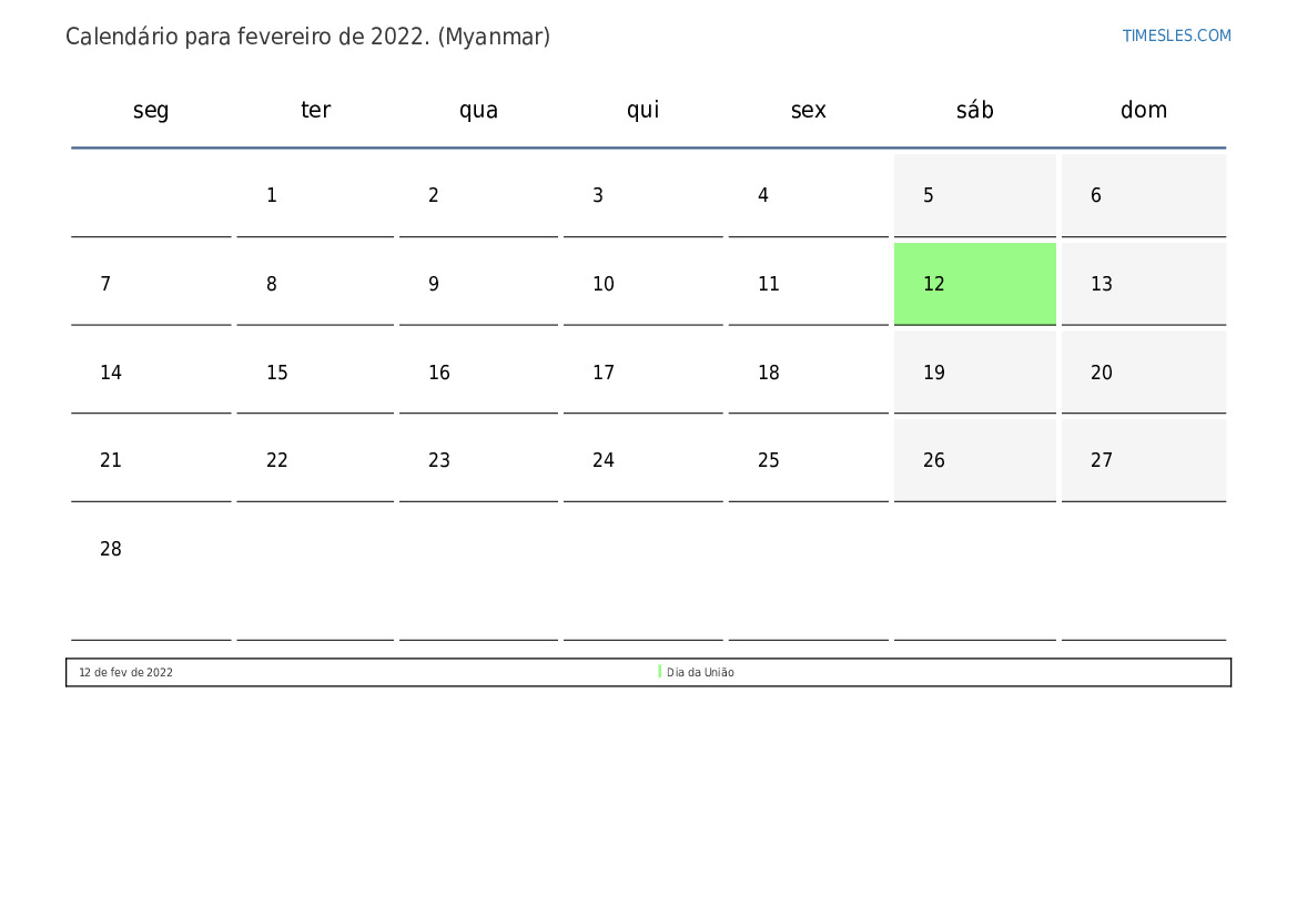 O mês de fevereiro contém 28 dias. Este é 2 mês de 2022. Estação do ano: inverno. O mês de fevereiro começa na terça-feira e termina na segunda-feira. No mês de fevereiro de 2022, há 1 feriado e dia de folga em Mianmar.