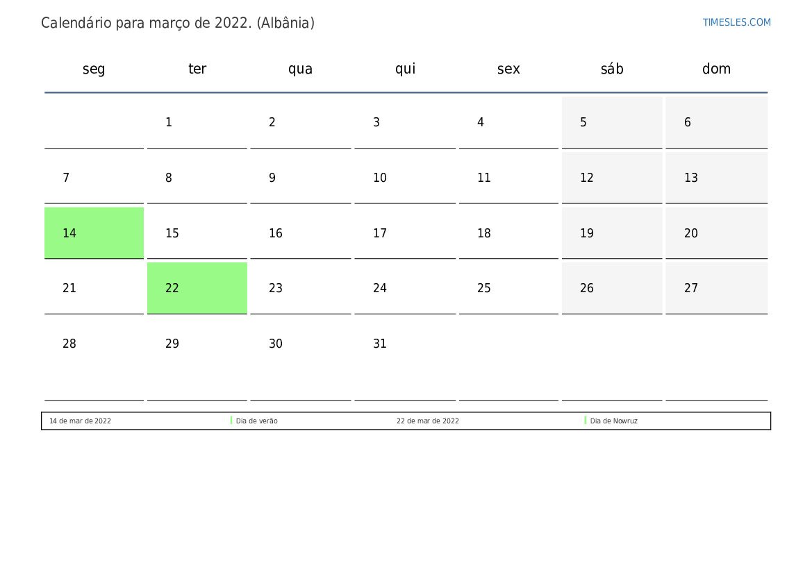 Calendário de feriados e fins de semana para março de 2022 para a Albânia