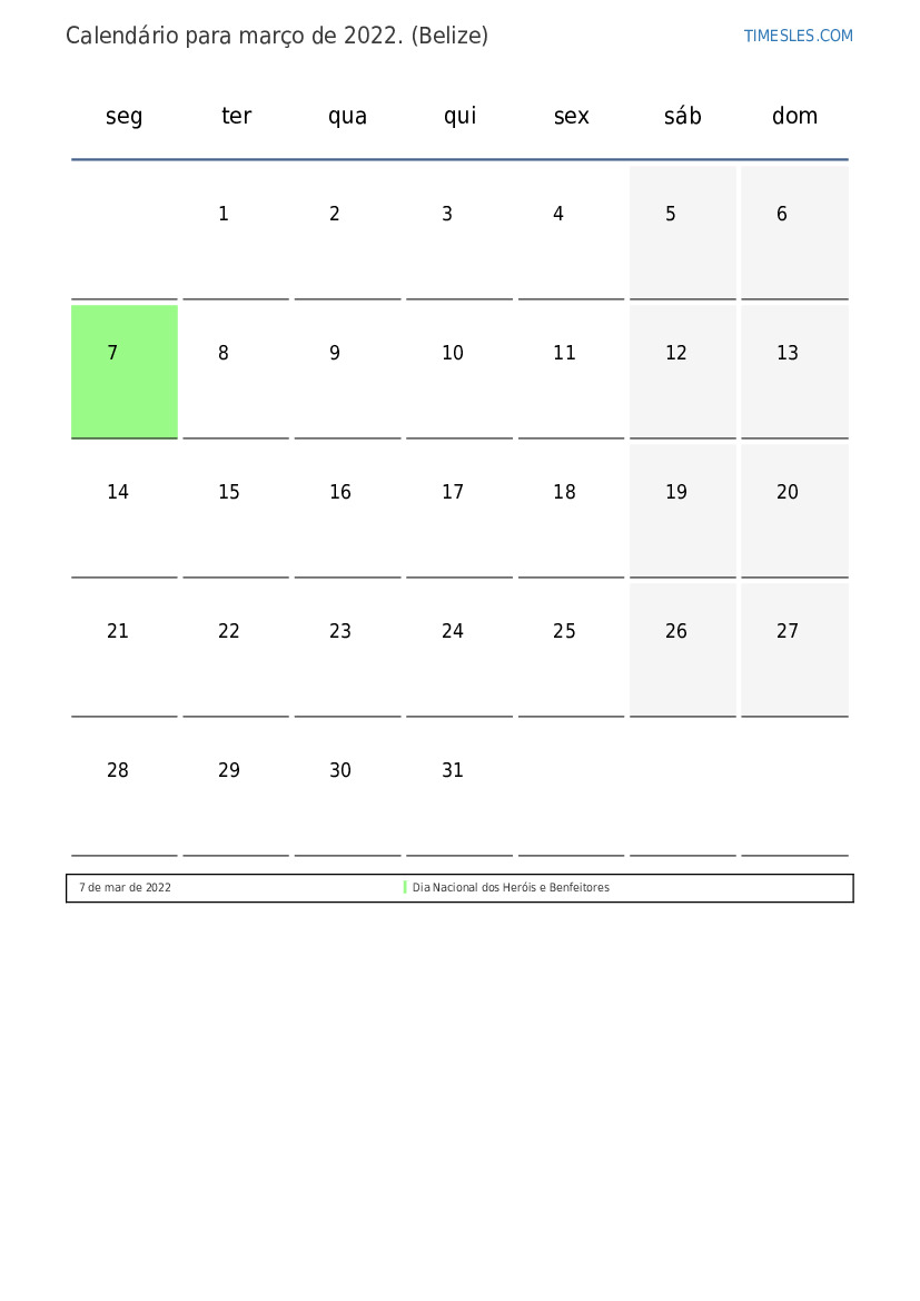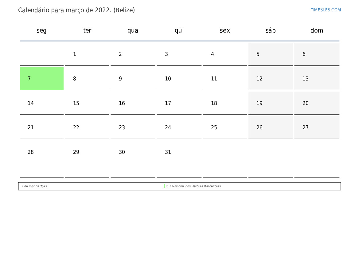 Calendário de feriados e fins de semana para março de 2022 para Belize