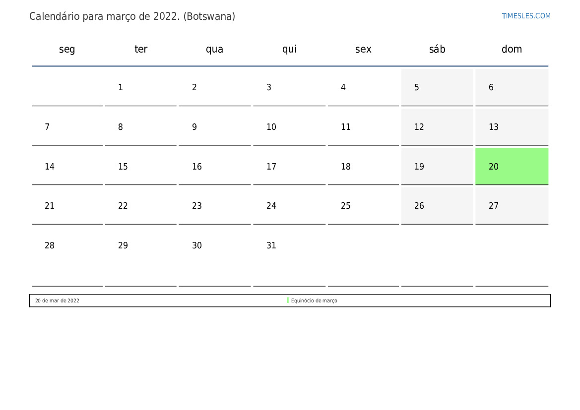 O mês de março contém 31 dias. Este é 3 mês de 2022. Estação do ano: primavera. O mês de março começa na terça-feira e termina na quinta feira. No mês de março de 2022, há 1 feriado e dia de folga em Botswana.