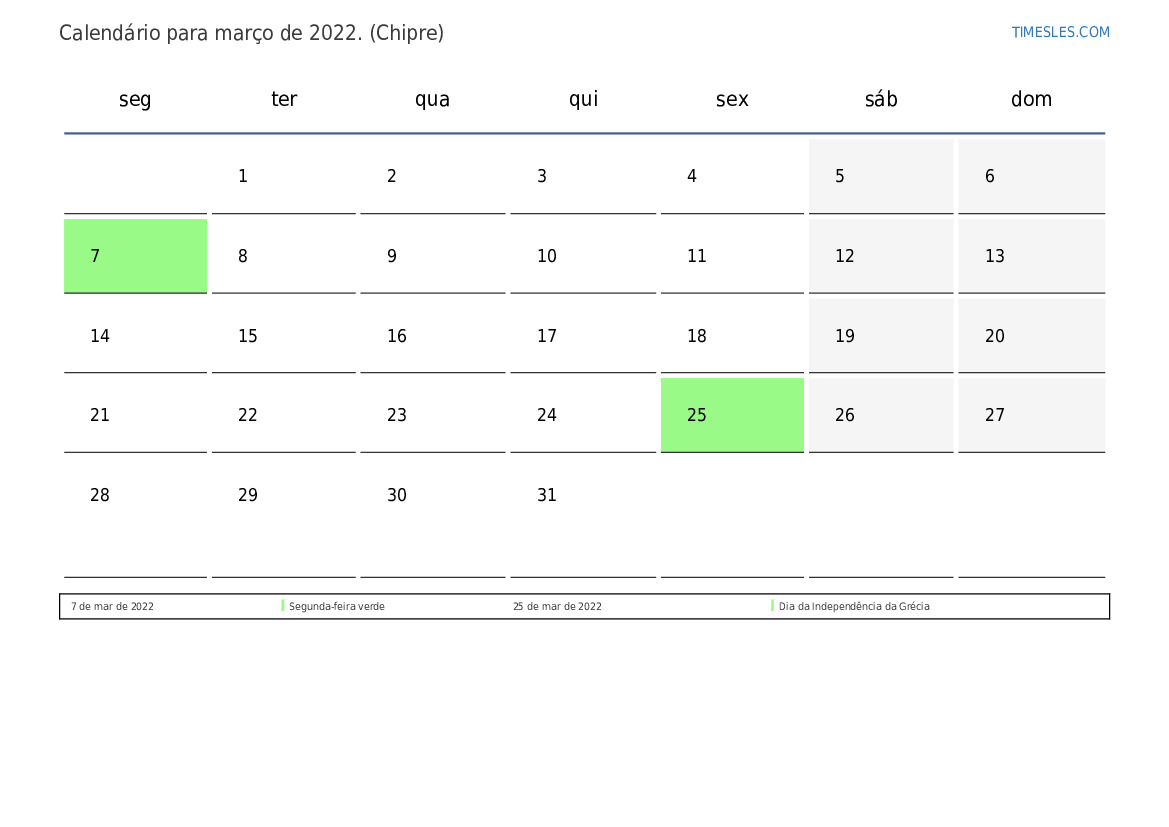 O mês de março contém 31 dias. Este é 3 mês de 2022. Estação do ano: primavera. O mês de março começa na terça-feira e termina na quinta feira. No mês de março de 2022, há 4 feriados e dias de folga em Chipre.