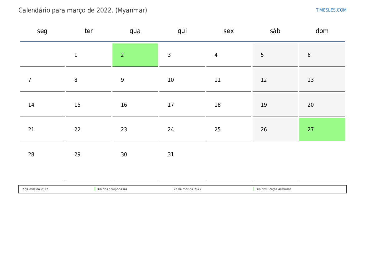 O mês de março contém 31 dias. Este é 3 mês de 2022. Estação do ano: primavera. O mês de março começa na terça-feira e termina na quinta feira. No mês de março de 2022, há 3 feriados e dias de folga em Mianmar.