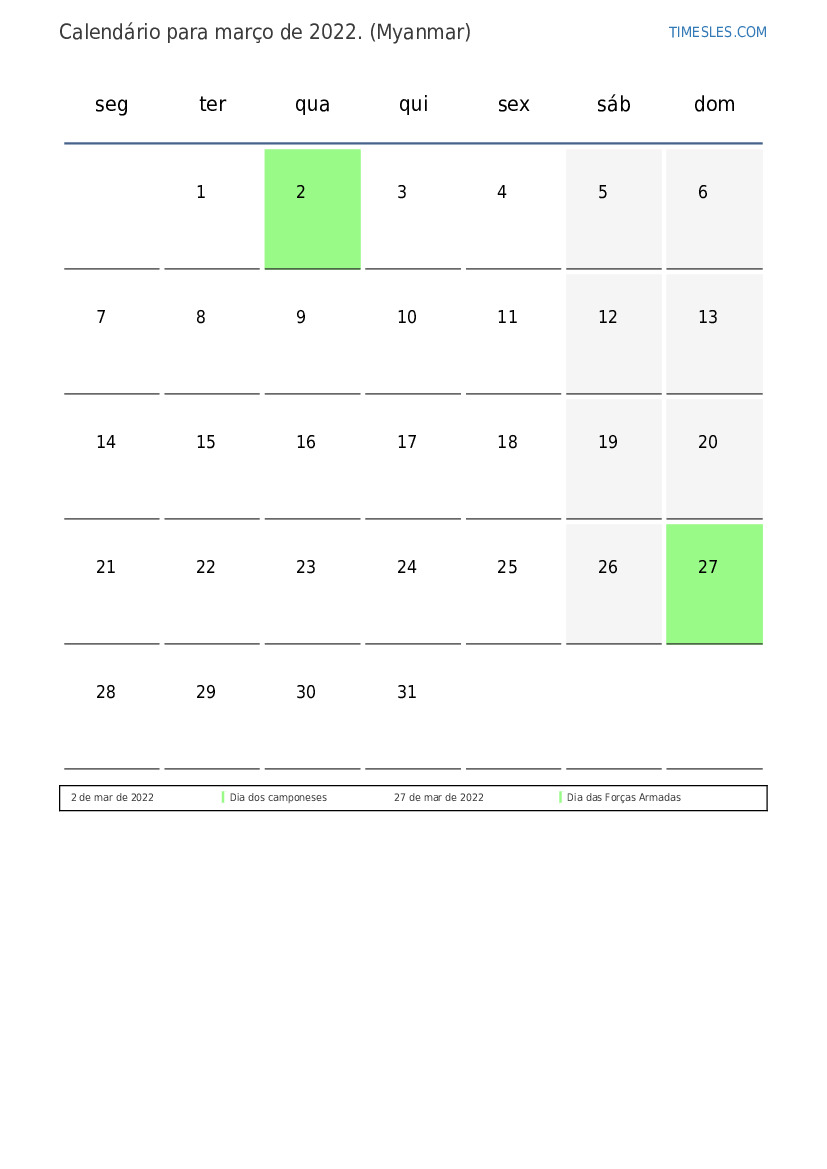 Calendário de feriados e fins de semana para março de 2022 para Mianmar