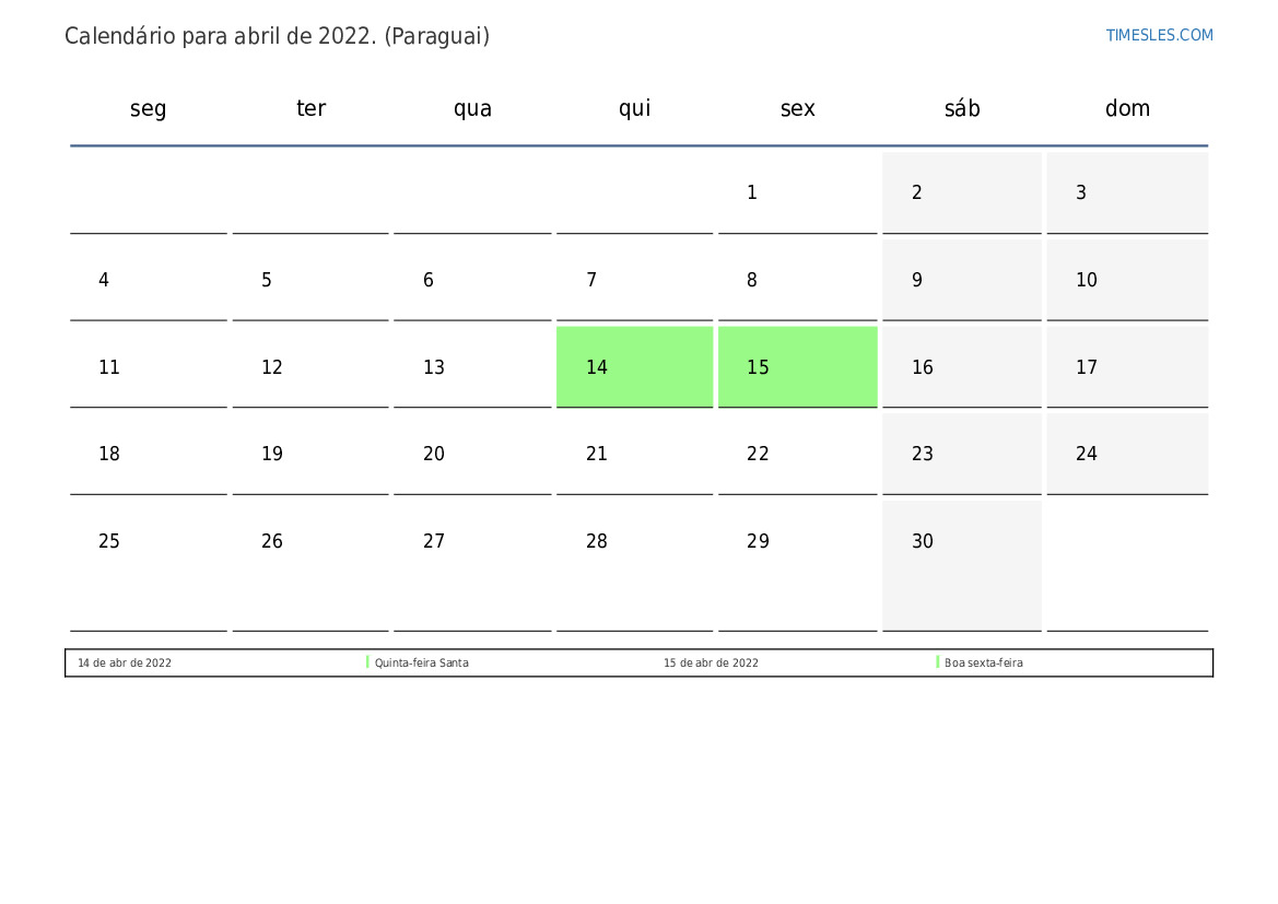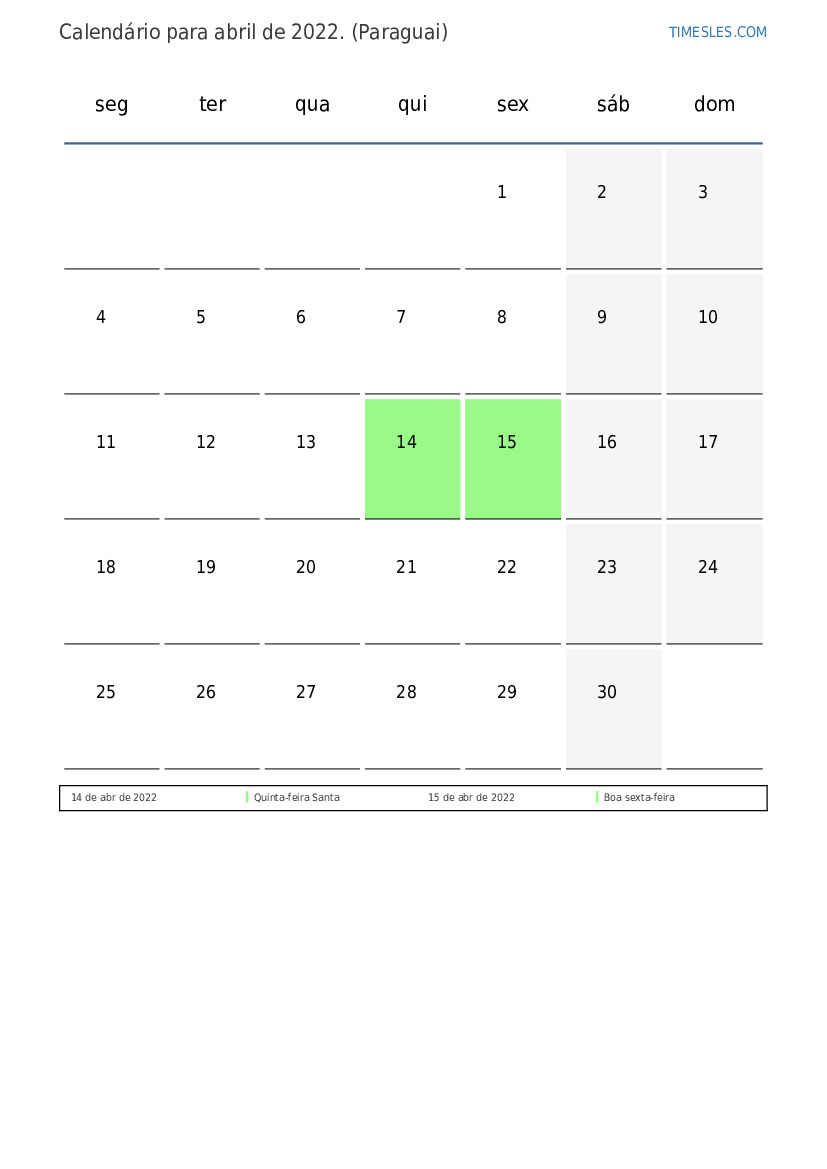 Calendário de abril de 2022 para o paraguai