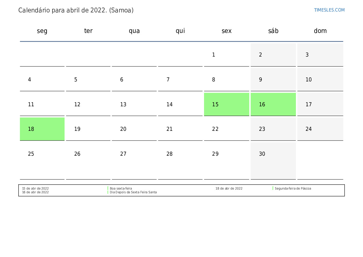 Calendário de feriados e fins de semana para abril de 2022 para Samoa