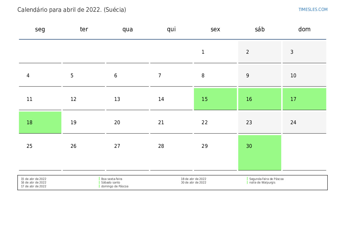 Calendário de feriados e fins de semana para abril de 2022 para a Suécia