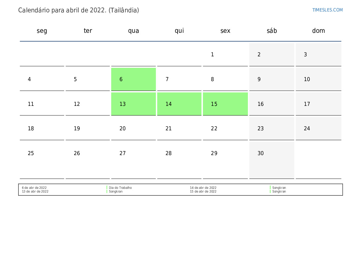 Calendário de feriados e fins de semana para abril de 2022 para a Tailândia