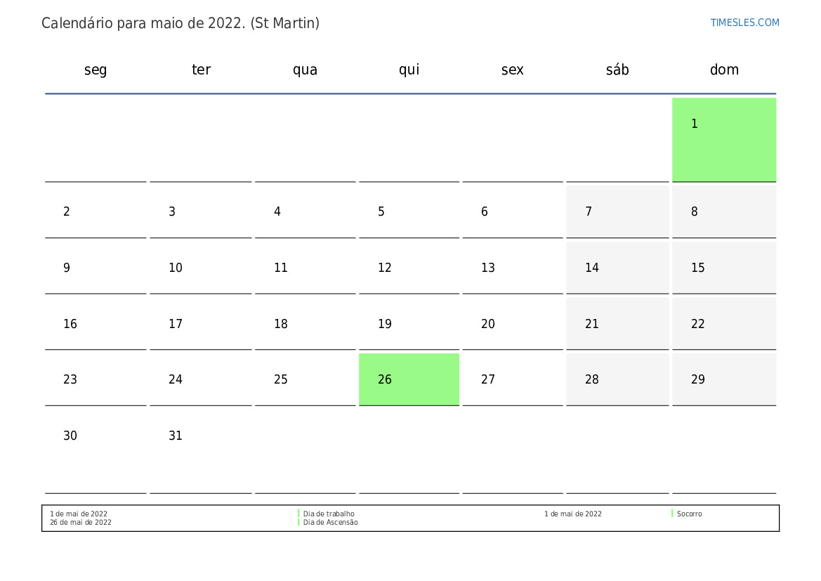 Calendário de feriados e fins de semana para maio de 2022 para Sint Maarten