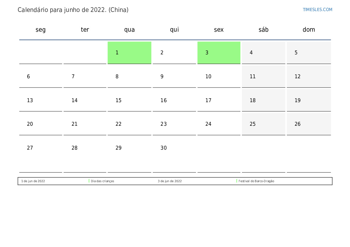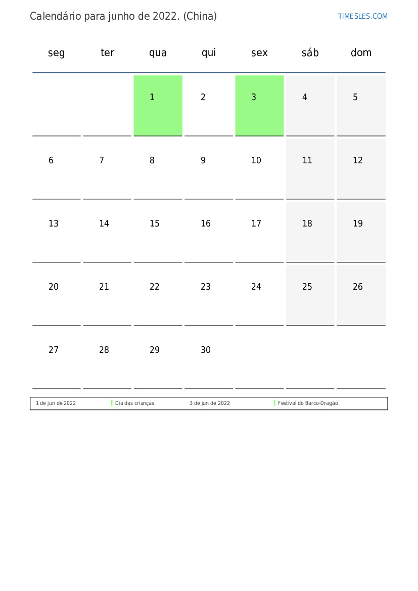 Calendário de feriados e fins de semana para junho de 2022 para a china