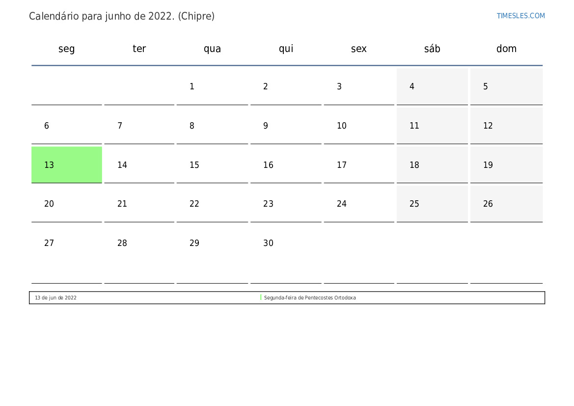 Calendário de feriados e fins de semana para junho de 2022 para Chipre