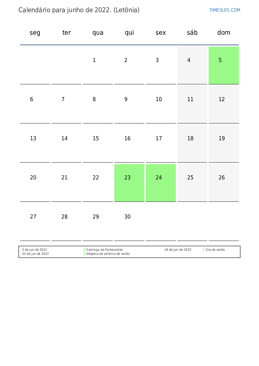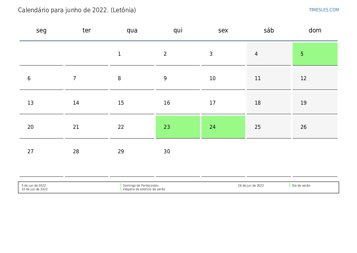 Calendário de feriados e fins de semana para junho de 2022 para a Letônia