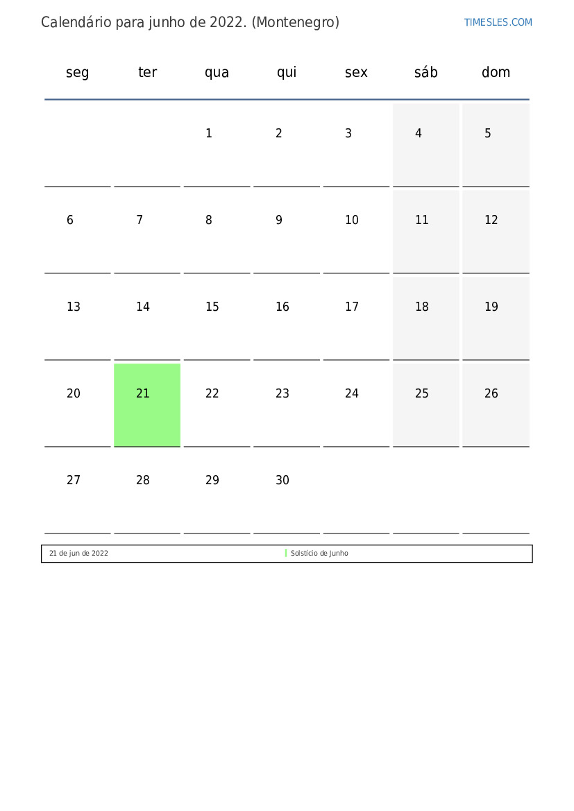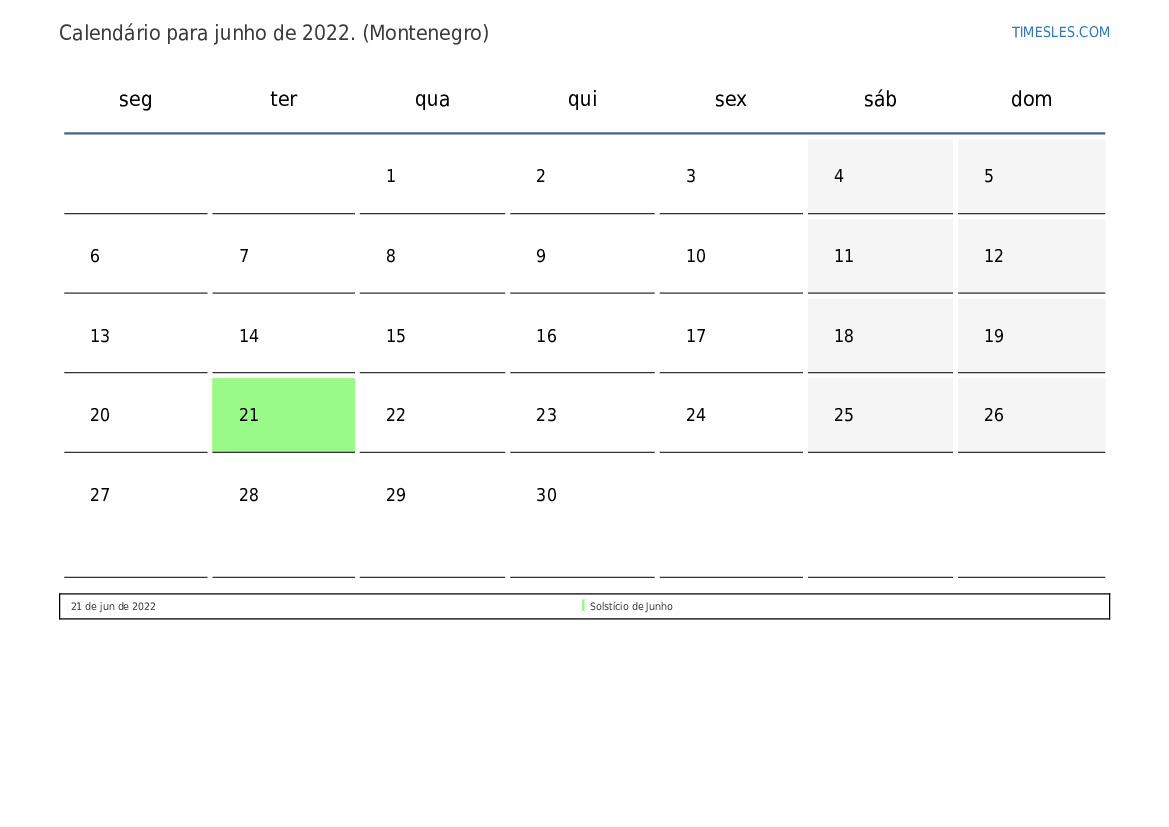 O mês de junho contém 30 dias. Este é 6 mês de 2022. Estação do ano: verão. O mês de junho começa na quarta-feira e termina na quinta feira. No mês de junho de 2022, há 1 feriado e dia de folga em Montenegro.