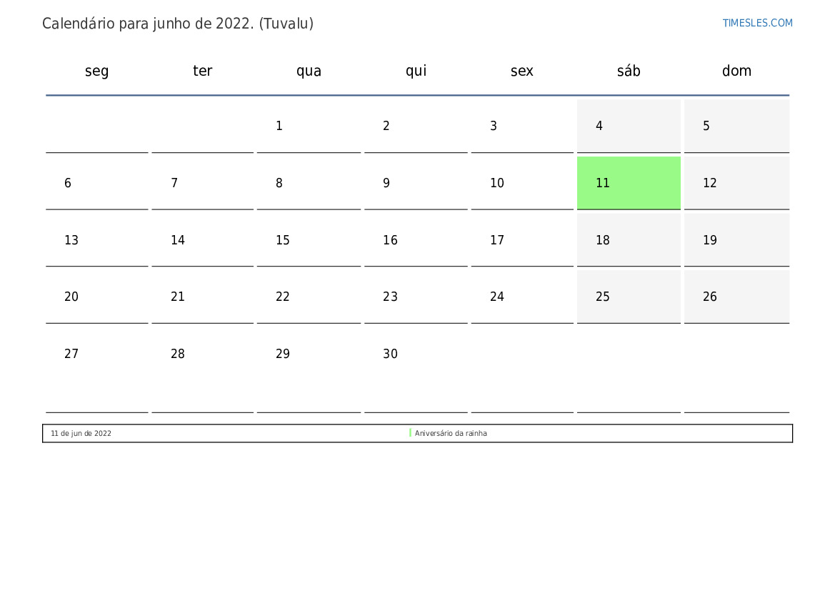 Calendário de feriados e fins de semana para junho de 2022 para Tuvalu