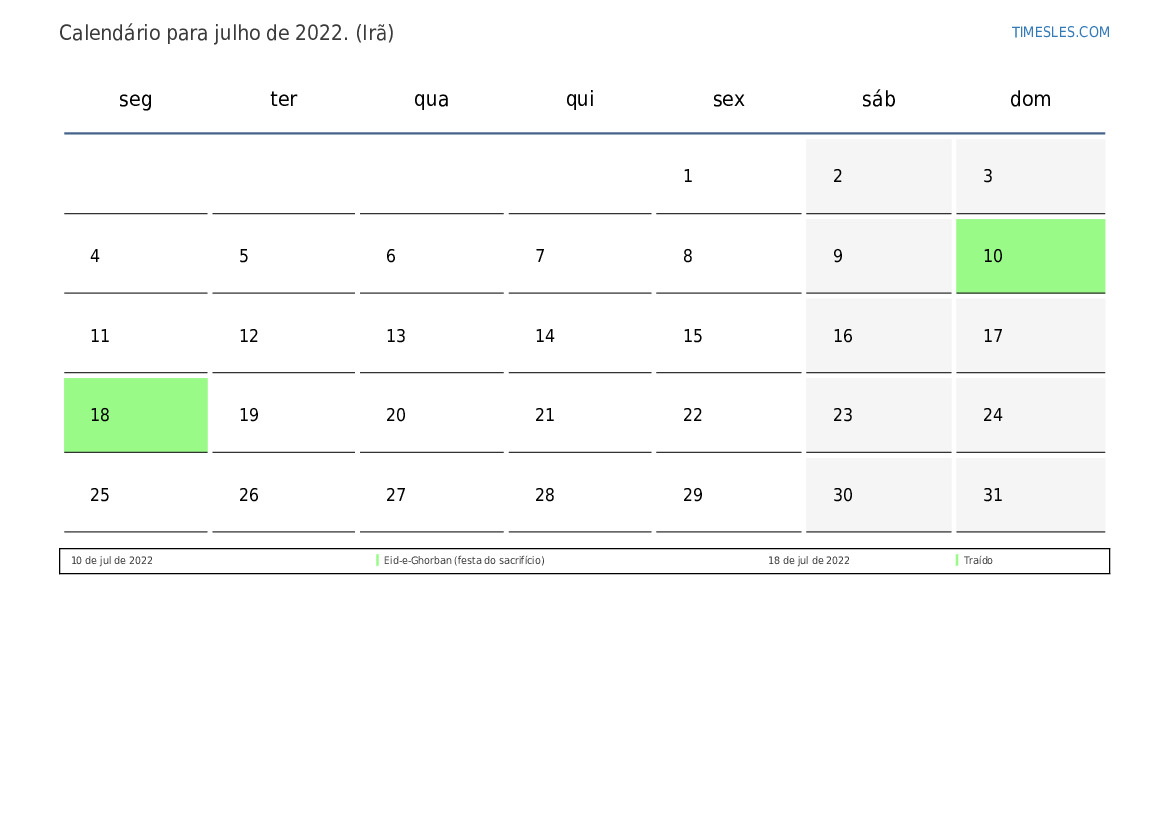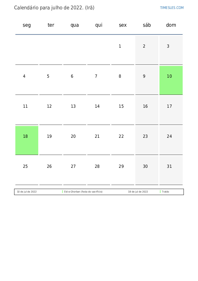 Baixe e imprima calendário em PDF com feriados e fins de semana para julho de 2022 para o irã