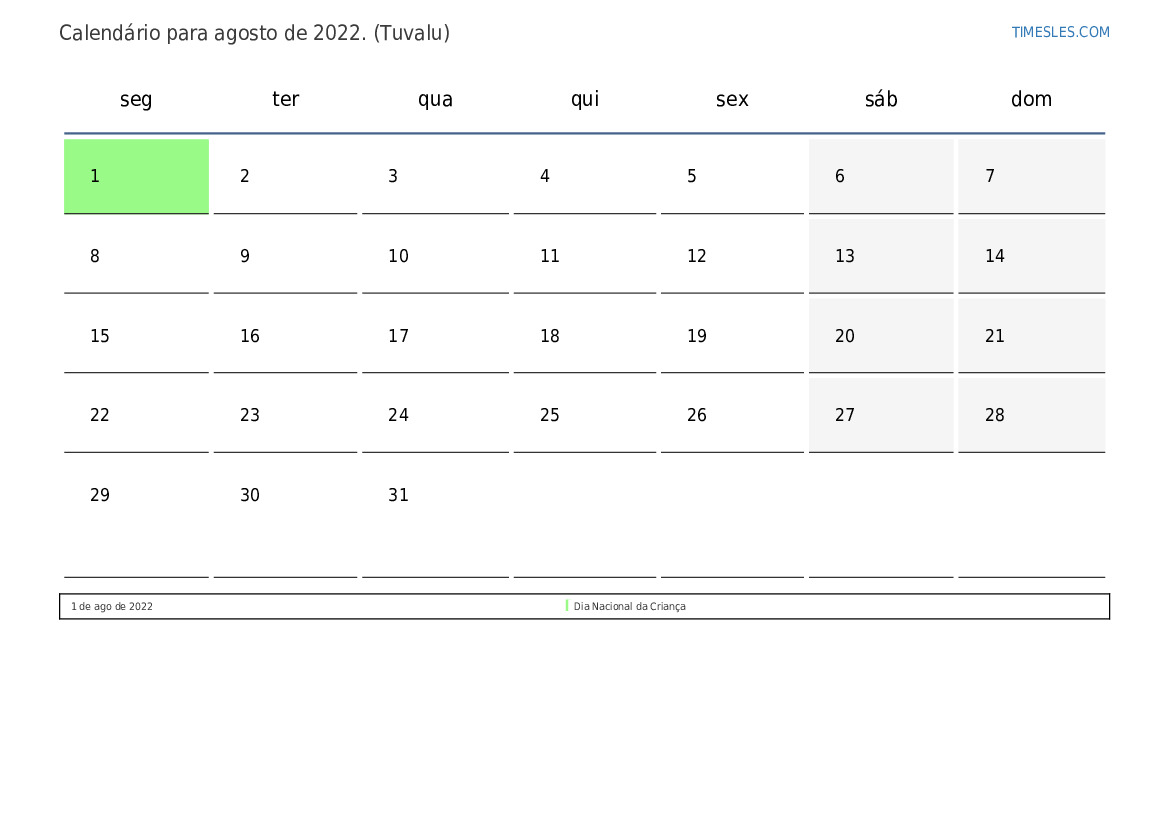 Calendário de feriados e fins de semana para agosto de 2022 para Tuvalu