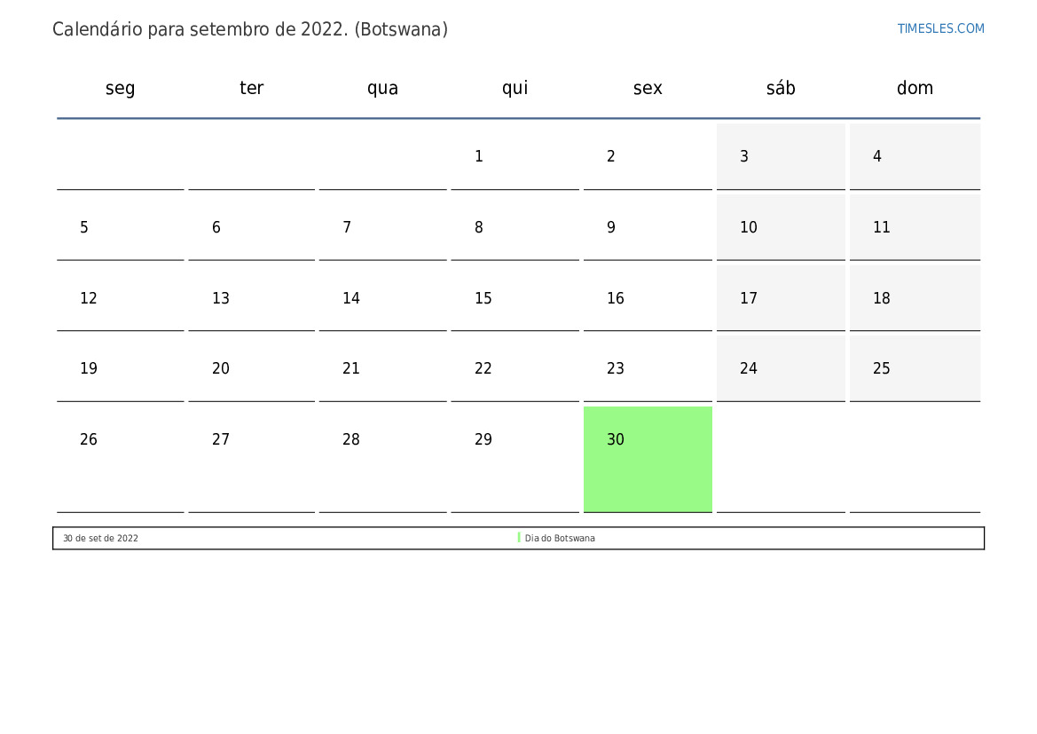 Calendário de feriados e fins de semana para setembro de 2022 para o Botswana