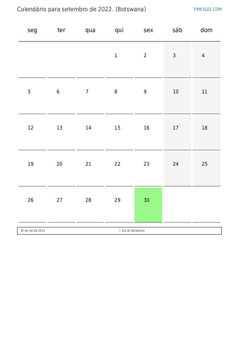 O mês de setembro contém 30 dias. Este é 9 mês de 2022. Estação do ano: outono. O mês de setembro começa na quinta feira e termina na sexta. No mês de setembro de 2022, há 2 feriados e dias de folga em Botswana.